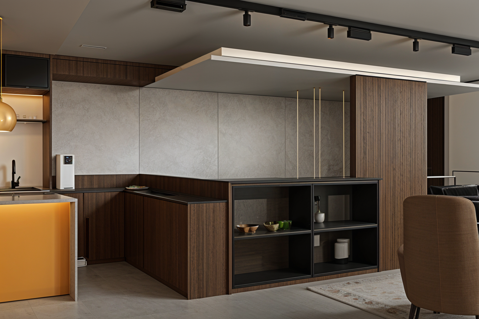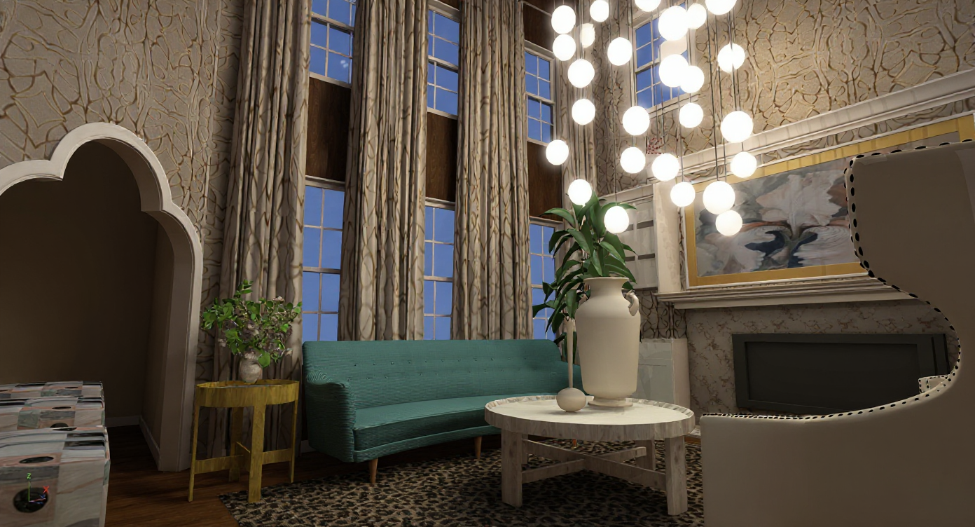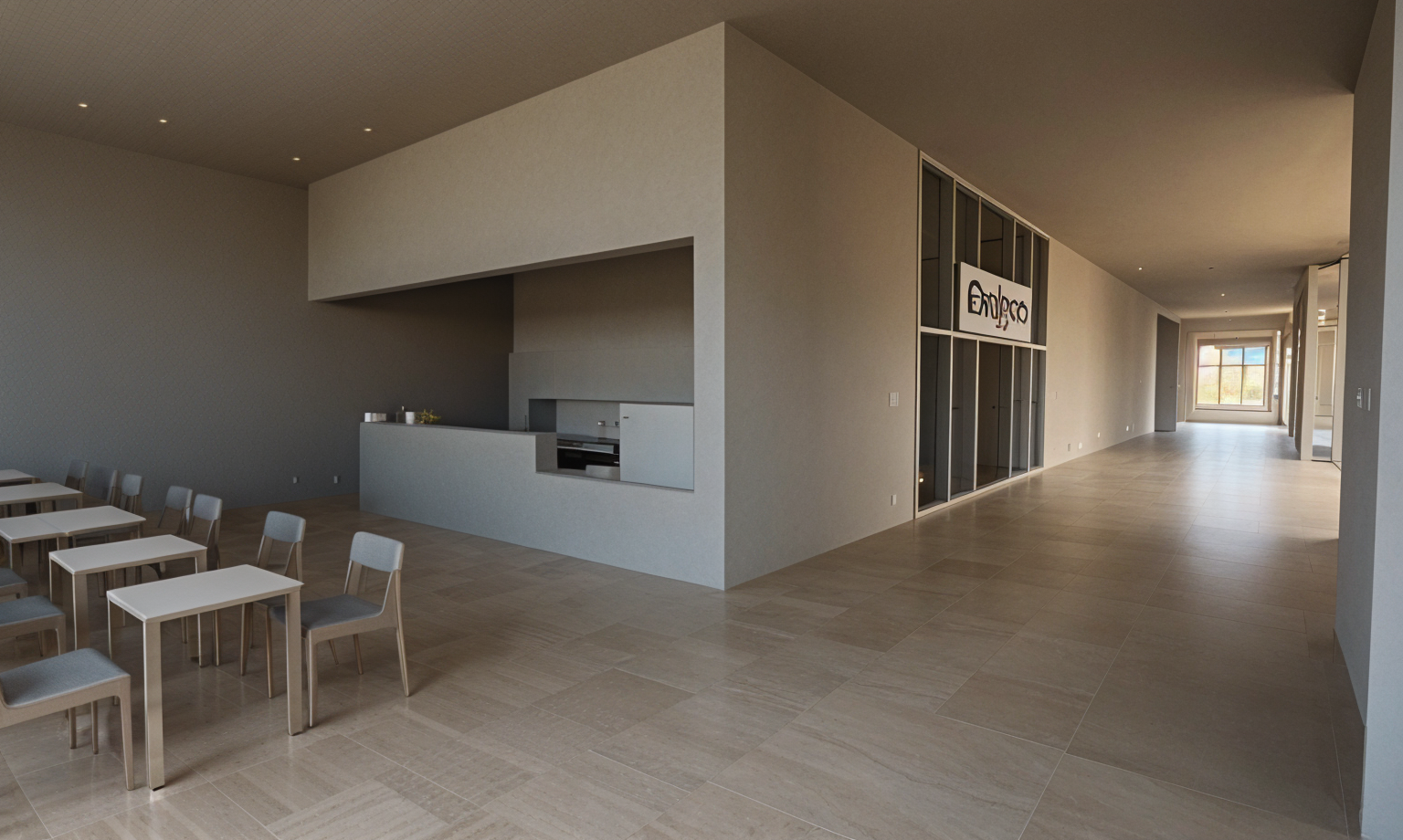 keep all geometry exactly as modeled with no changes including the caf counter wall openings gift shop storefront seating layout corridor proportions and glazing systems do not add remove or modify any architectural elements or furniture use smooth warm concrete for all walls and ceilings with a subtle beige tint that matches the rest of the building s interior palette render the floor with warm ceramic tile and soft natural veining throughout the caf corridor and gift shop area keep all window frames mullions and metal supports in a beige matte aluminum finish with a clean contemporary satin surface do not allow concrete or wood to appear on the frames render the glazing with soft reflections and slight transparency so the glass is clearly visible and realistic not invisible for the caf furniture keep the tables and chairs exactly as modeled but render them in light natural wood with a matte finish do not change their geometry use bright warm indoor daylight entering from the glazing along the corridor avoid dark shadows dramatic lighting or spotlight effects replace the existing storefront sign text with the words gift shop in clean modern black sans serif lettering on a white background do not change the sign frame placement or size only the text inside it do not add any merchandise decorations displays products signage people or objects not present in the model keep the environment minimal architectural and museum like