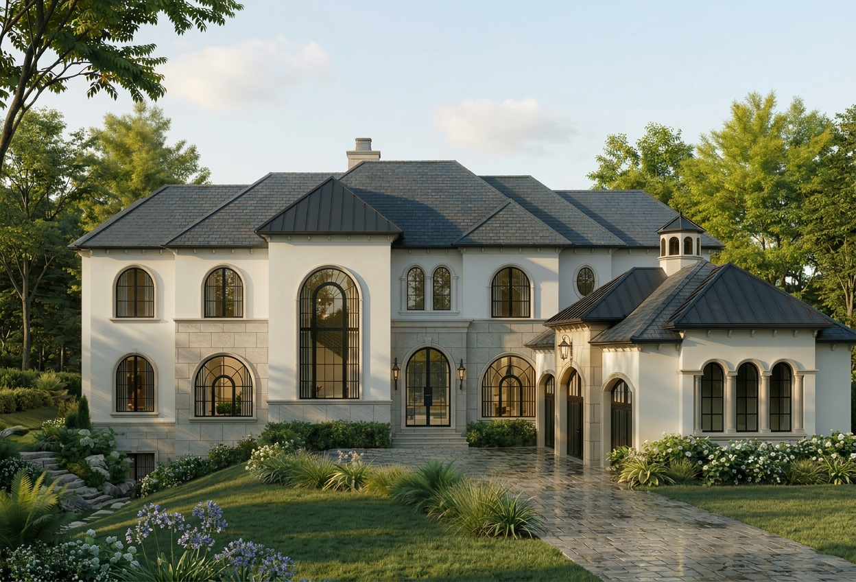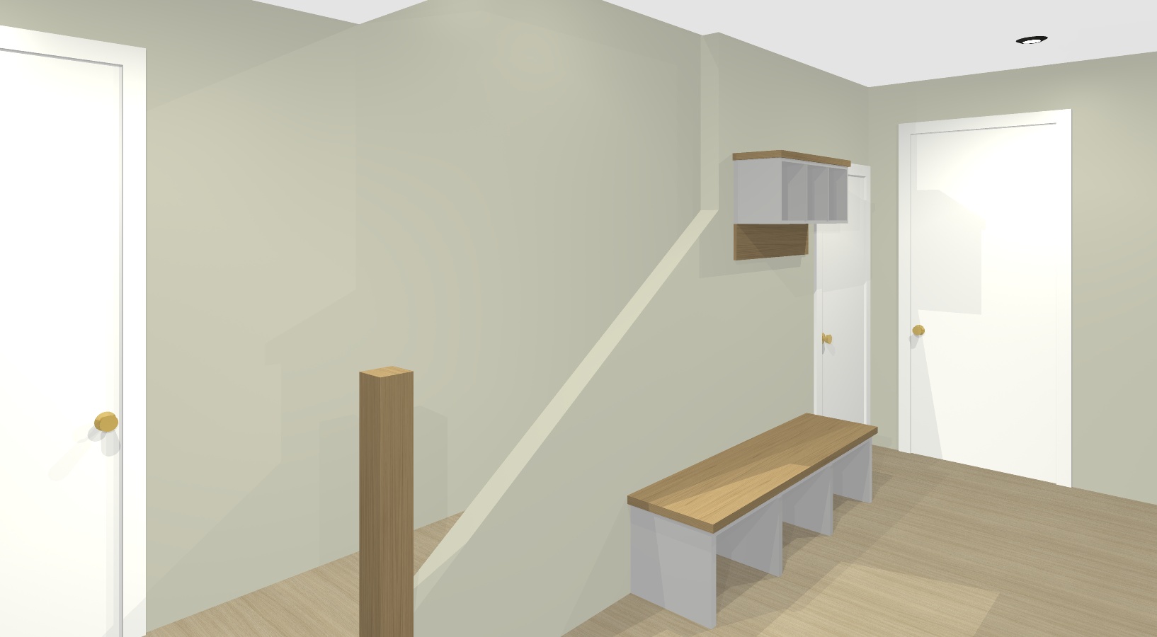 render a modern hallway interior with a cozy inviting atmosphere the walls are soft beige creating a warm ambiance the floor is light oak wood enhancing the natural feel the doors are a crisp white with black knobs for a touch of elegance a wooden bench with a white base sits against the wall above the bench a matching wooden shelf unit with white compartments with hats and coat hooks is mounted above the bench the overall lighting is soft and ambient with a small ceiling light fixture for subtle illumination a stairway leads up to a loft with a wooden newel post and black metal railing going up the rake wall