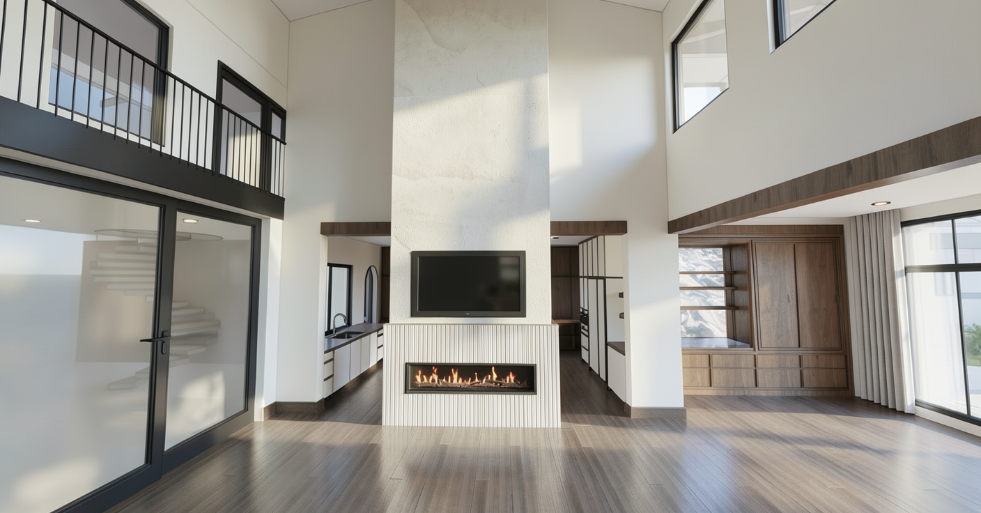 make all windows fully transparent and clear showing the scene outside do not add frosting blur or opacity to the glass enhance the lighting in the room to feel warm and realistic use soft natural light bounce subtle shadows and warm ambient illumination while preserving the exact existing materials colors and layout