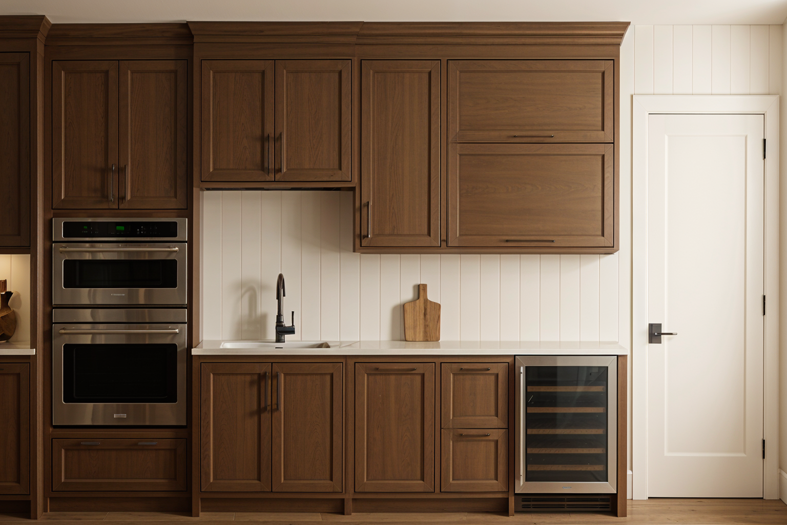 ad cookbooks on shelves and dog bowl under shelves add large dining table and couch and chairs make floor slightly darker sunset outside