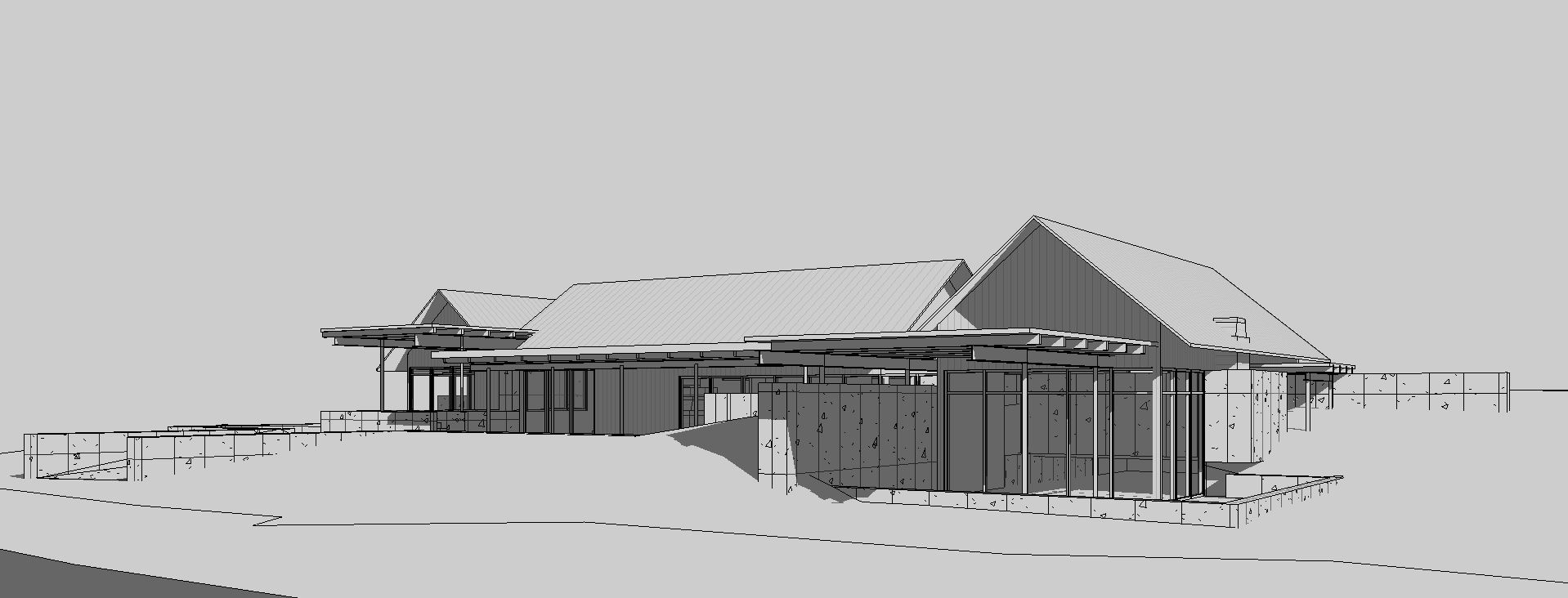 industrial home design corten steel and concrete panels sunlight on building face metal roof tall grass in foreground fog red steel beam