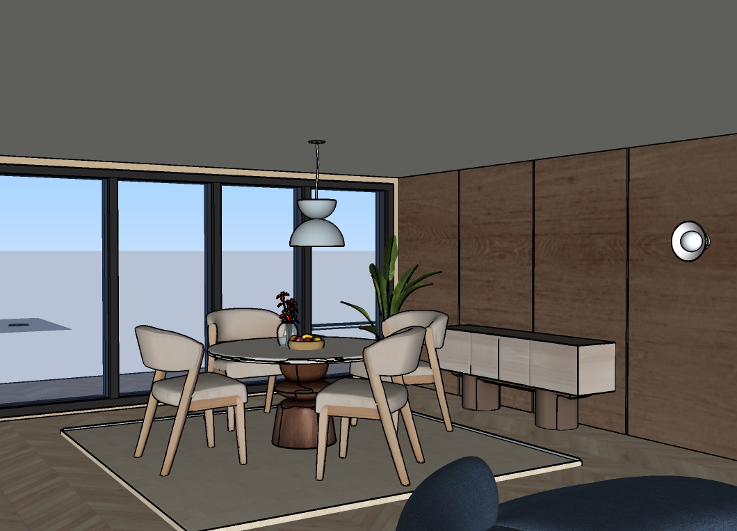 a modern dining room with floor to ceiling windows allowing natural light to flood the space the walls are covered in rich warm brown wood paneling providing a cozy yet sophisticated atmosphere a round wooden dining table with dark walnut finish stands in the center surrounded by four plush cream colored upholstered chairs above a sleek pendant lamp with a soft gray hue casts a warm glow a sideboard with a light oak finish rests against the wall adorned with a vibrant green potted plant a bowl of assorted fruits adds a pop of color the floor features a herringbone pattern in a muted beige tone enhancing the elegant feel the overall atmosphere is inviting and serene perfect for intimate gatherings