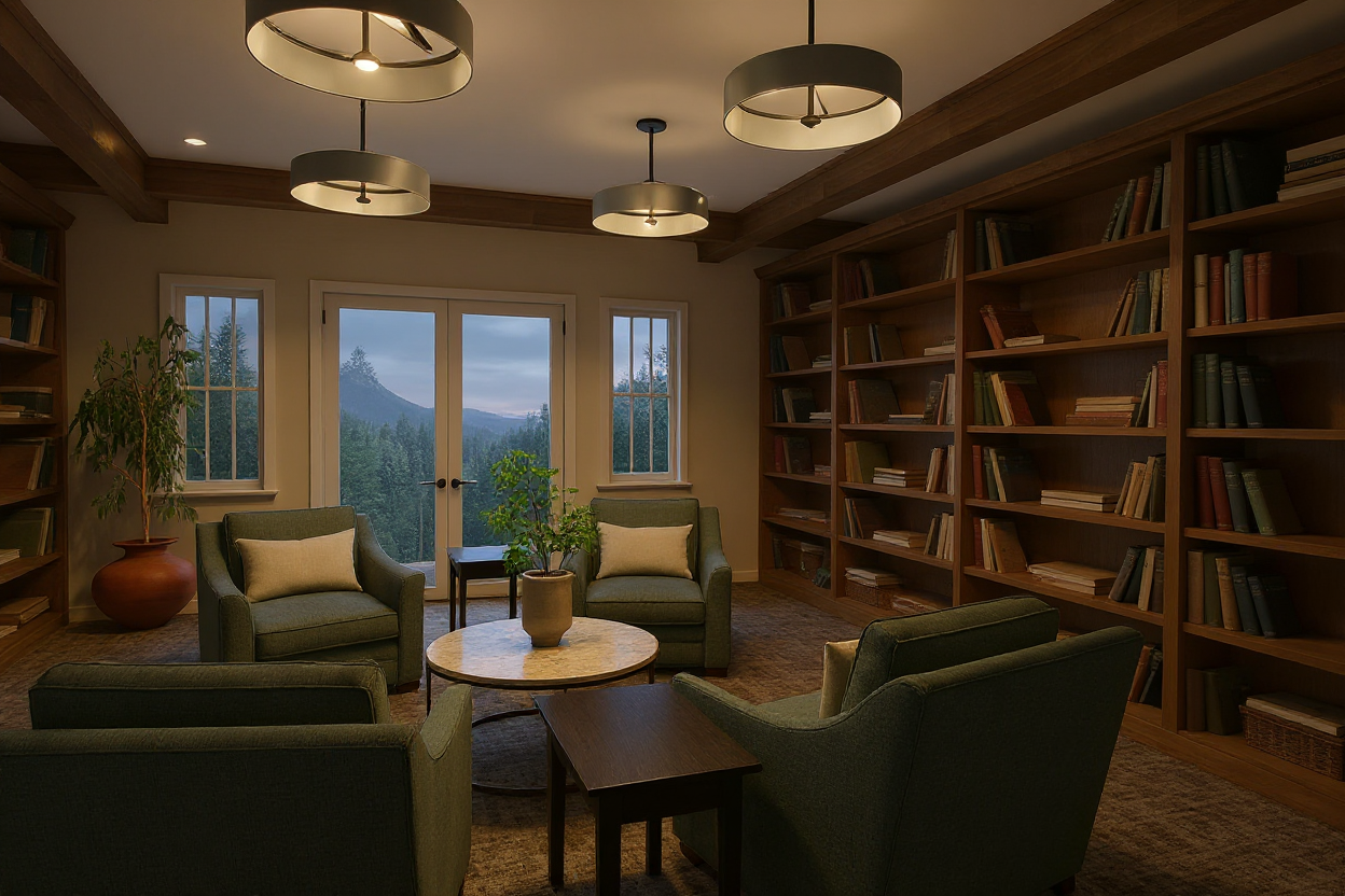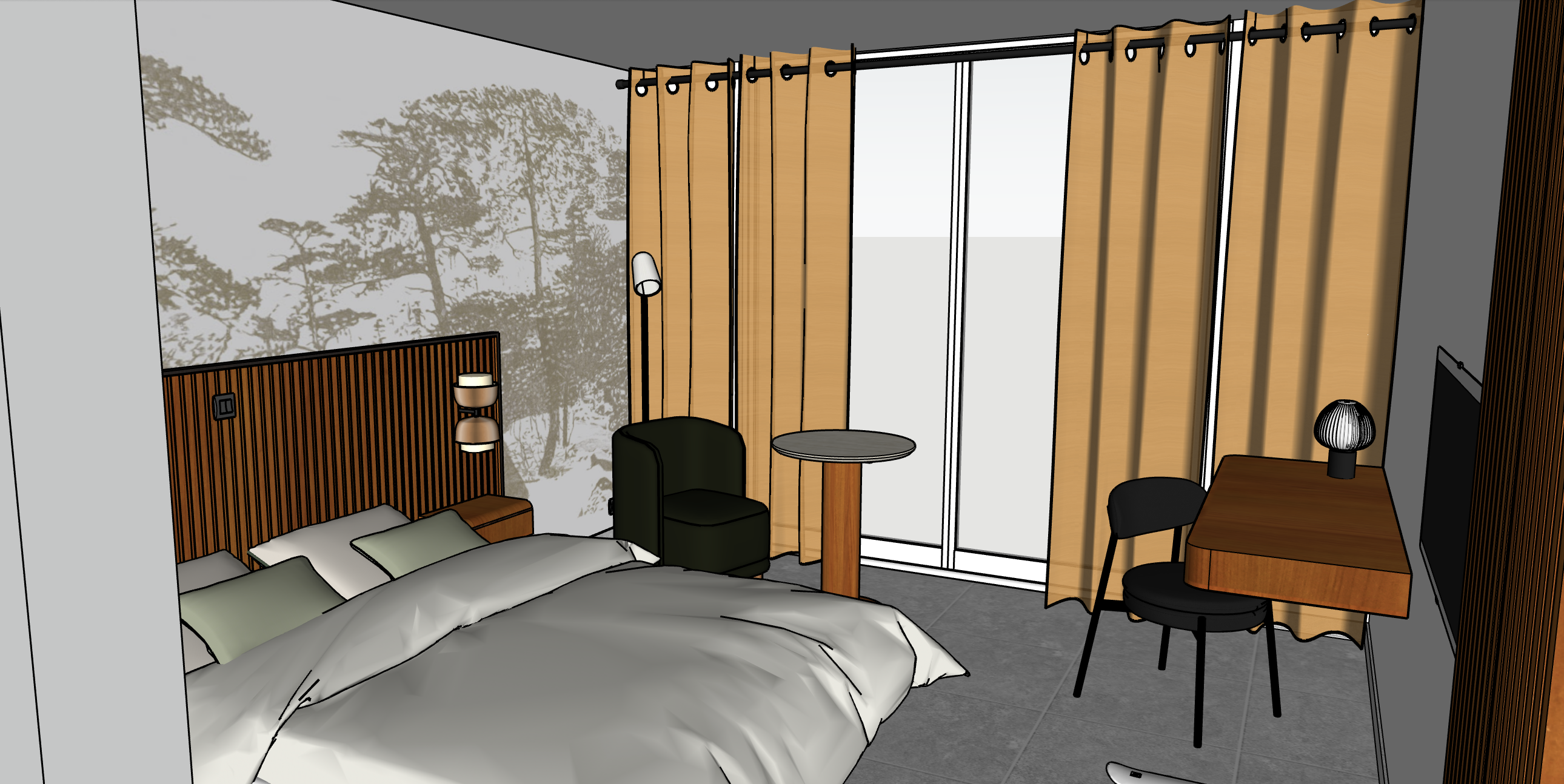 transform this 3d sketchup view into a photorealistic rendering preserving the framing and geometry natural lighting is used with a color temperature between 2700 and 3000 k and soft shadows the textures are crisp the reflections realistic and no objects have been added or modified
