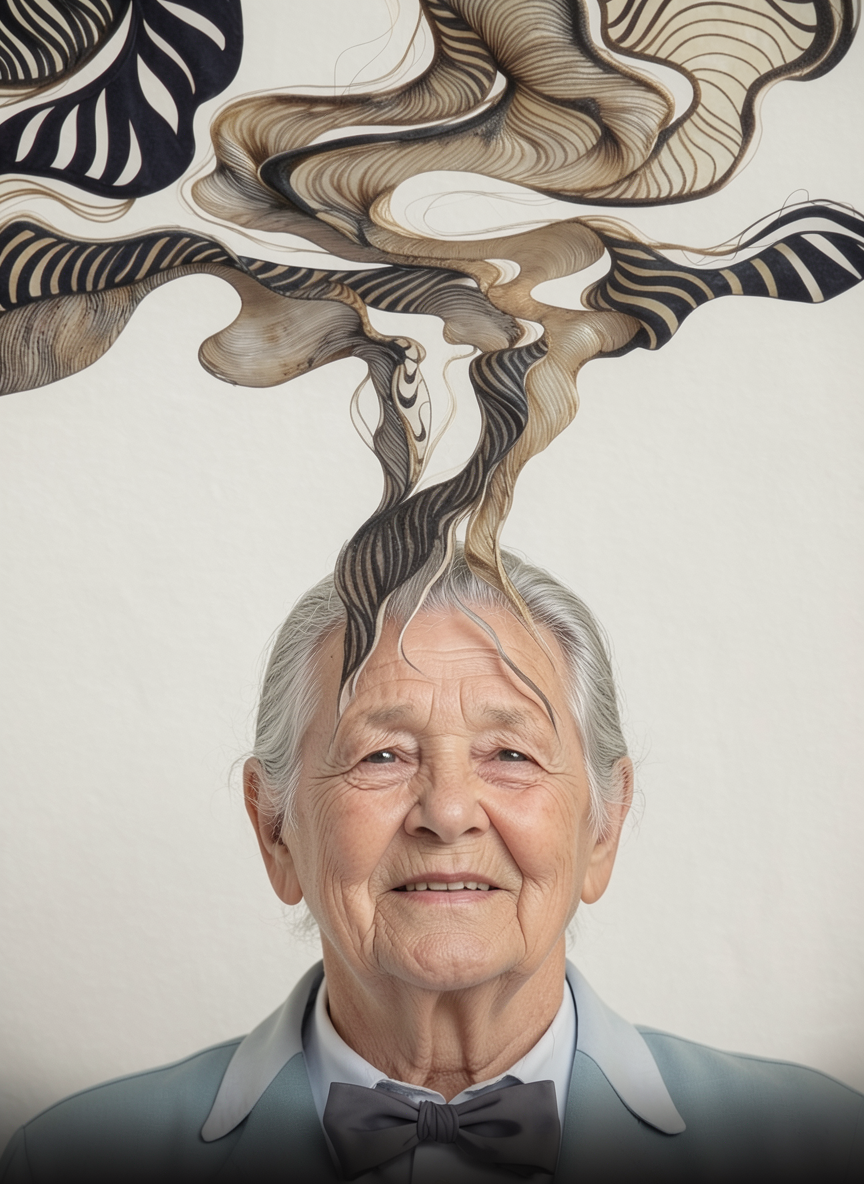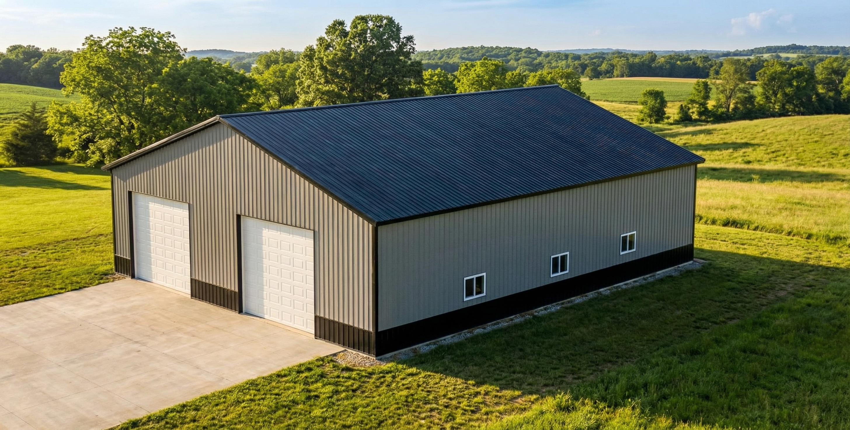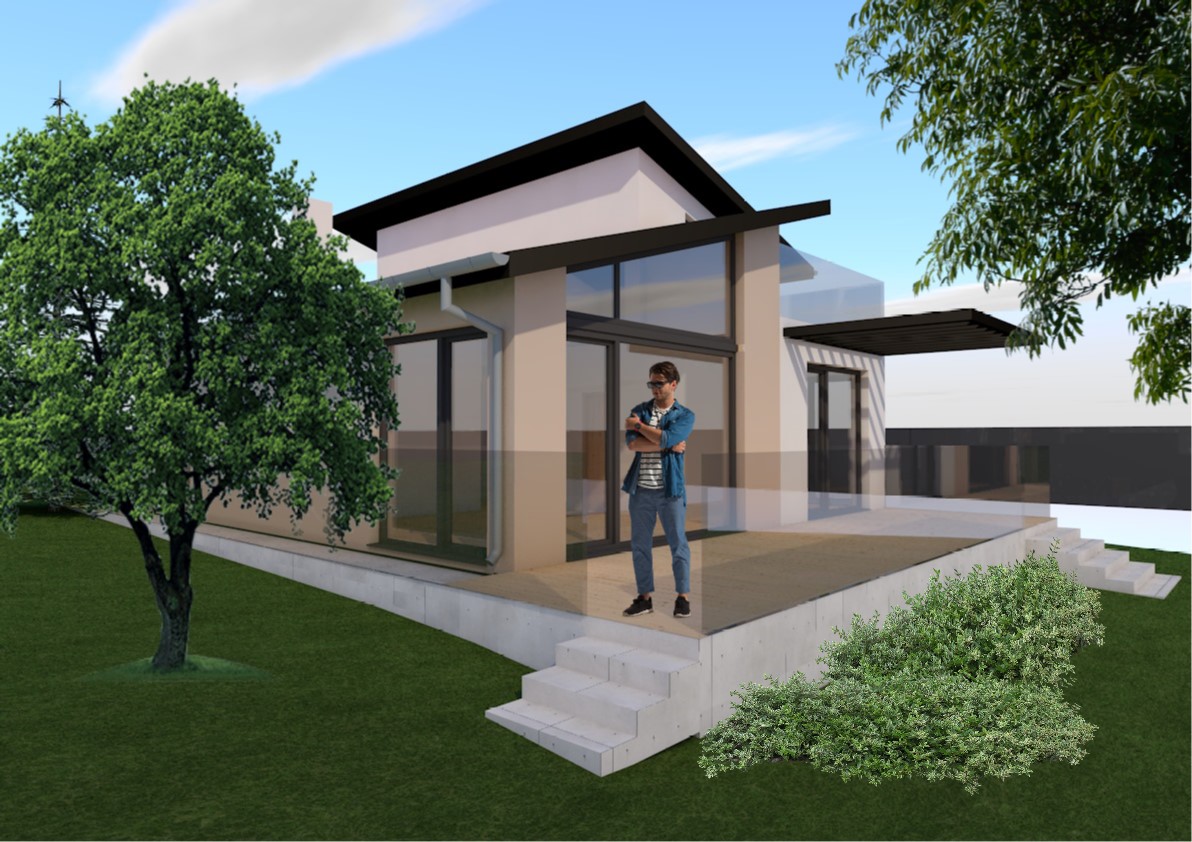 modern architectural house with a minimalist design featuring beige walls and large glass windows the roof has sleek black lines a person stands on the wooden deck wearing casual blue and white clothing the foreground has vibrant green grass and shrubs with a large leafy tree to the side the background is a clear blue sky with fluffy white clouds the atmosphere is serene and modern exuding a sense of harmony and tranquility