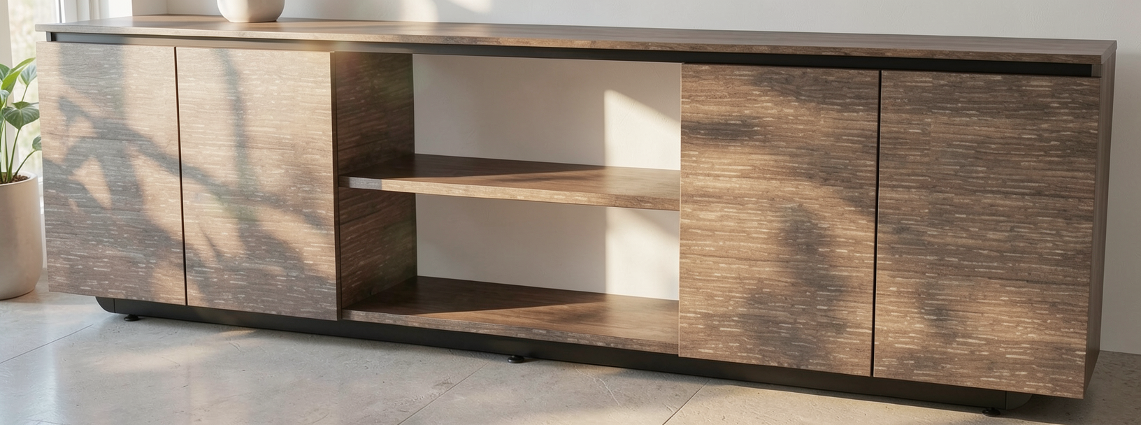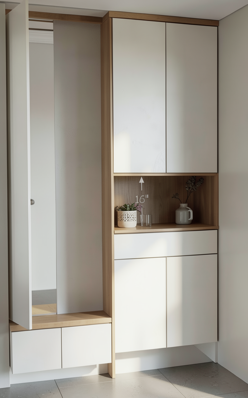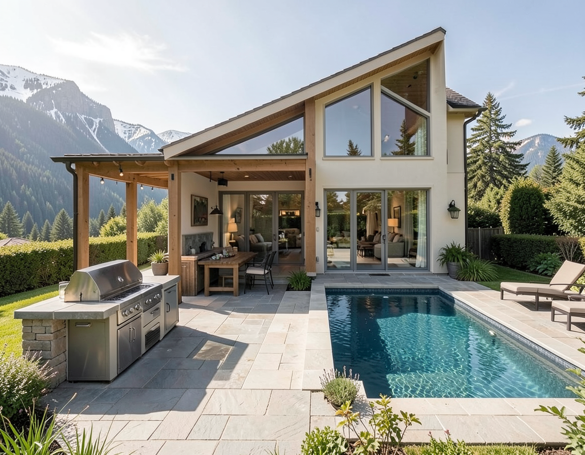 upper roof black asphalt shingles lower roof metal roofing white board and batten siding black windows add gutters and downspouts a few trees in the background light landscaping to the front maintain geometry
