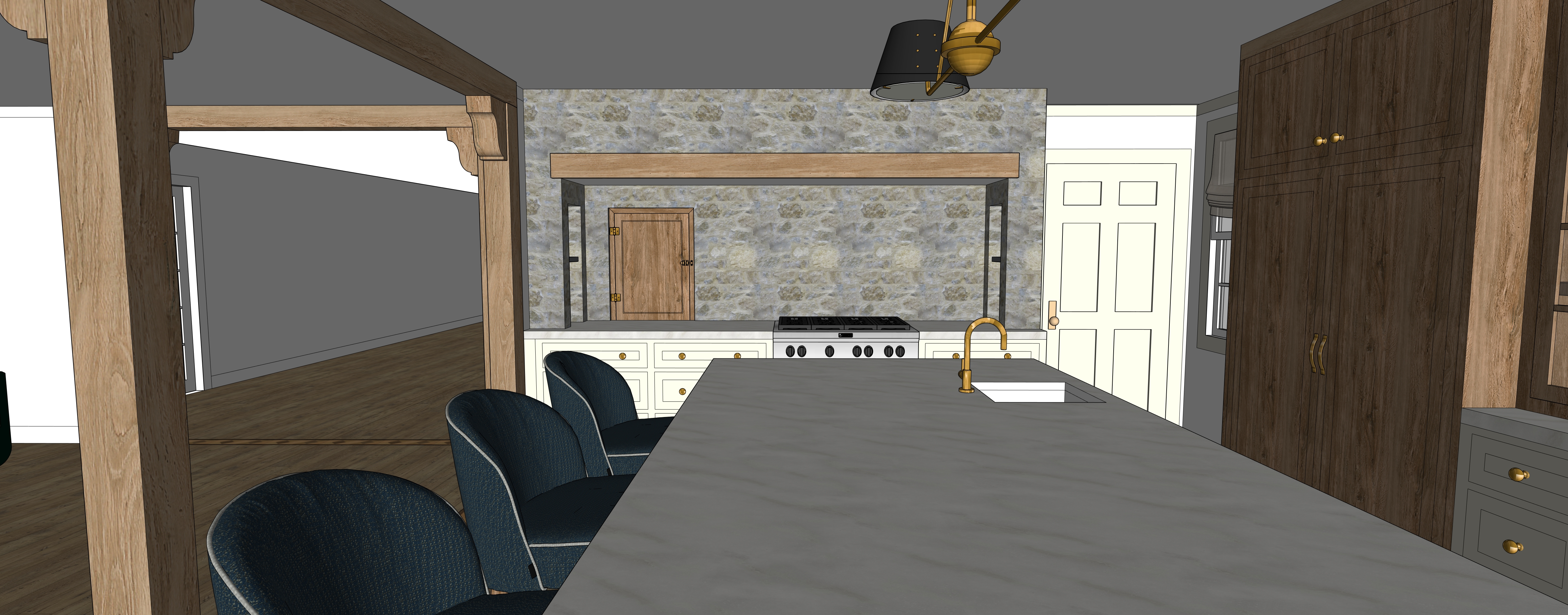 create a highly photorealistic rendering of a traditional kitchen using the provided image as a fixed architectural model maintain all geometry exactly as shown island size and placement cabinetry layout range wall openings lighting fixtures and camera perspective must not change this is a final finishes rendering intended to feel like a professionally photographed interior overall mood warm refined and softly moody balanced contrast not flat not dramatic natural timeless and material driven materials wood primary fix warm natural oak with clear grain variation and tonal depth slight aging and softness avoid raw or orange tones matte finish columns slightly deeper richer than island tall cabinetry on right reads slightly richer and deeper than island tone add shadowing at joints seams and leg transitions current issue wood still reading slightly flat and uniform perimeter cabinetry soft off white warm beige matte finish slight variation panel to panel deepen shadows in door profiles drawer reveals island same wood family but slightly richer tone add shadow under overhang darker tone at base subtle wear at edges countertops honed marble soft gray with warm undertones subtle veining low contrast matte finish no shine stone walls critical correction limestone look tones warm gray beige soft taupe reduce contrast by 30 40 blend transitions between stones add soft shadow in joints slight surface irregularity must feel quiet and tonal not busy or patchy range wall same stone tone control keep visual calm no focal contrast spikes wood shelf above range remains slightly deeper in tone for contrast hardware fixtures aged brass muted soft patina no bright reflections barstools deep blue green upholstery matte woven texture visible but subtle slight variation between stools wood legs warm and natural lighting final pass most important natural light soft daylight entering from window side right of frame indirect diffused and even slight brightness falloff toward foreground island surface interior lighting pendants very soft glow only no visible hotspots shades remain mostly dark sconces not in direct view but influencing space soft warm ambient contribution shadow grounding fixes critical add stronger contact shadows island legs to floor stool legs to floor cabinetry toe kicks add shadow under island overhang slight darkening beneath stools soft gradient across floor plane this eliminates any floating effect depth contrast foreground island surface slightly darker and grounded midground range cabinetry balanced back wall slightly lifted but still soft creates natural depth and hierarchy color temperature 3000 3500k warm neutral balanced no yellow cast realism boosters ambient occlusion at cabinet seams floor junctions under hardware micro variation wood tone shifts slight paint inconsistency subtle imperfections slight desaturation 5 10 for realism camera output maintain current closer slightly lowered perspective eye level 5 ft 28 35mm lens high dynamic range 4k 8k resolution rendering style editorial interior photography soft contrast not flat materials feel tactile and real no glossy or artificial surfaces