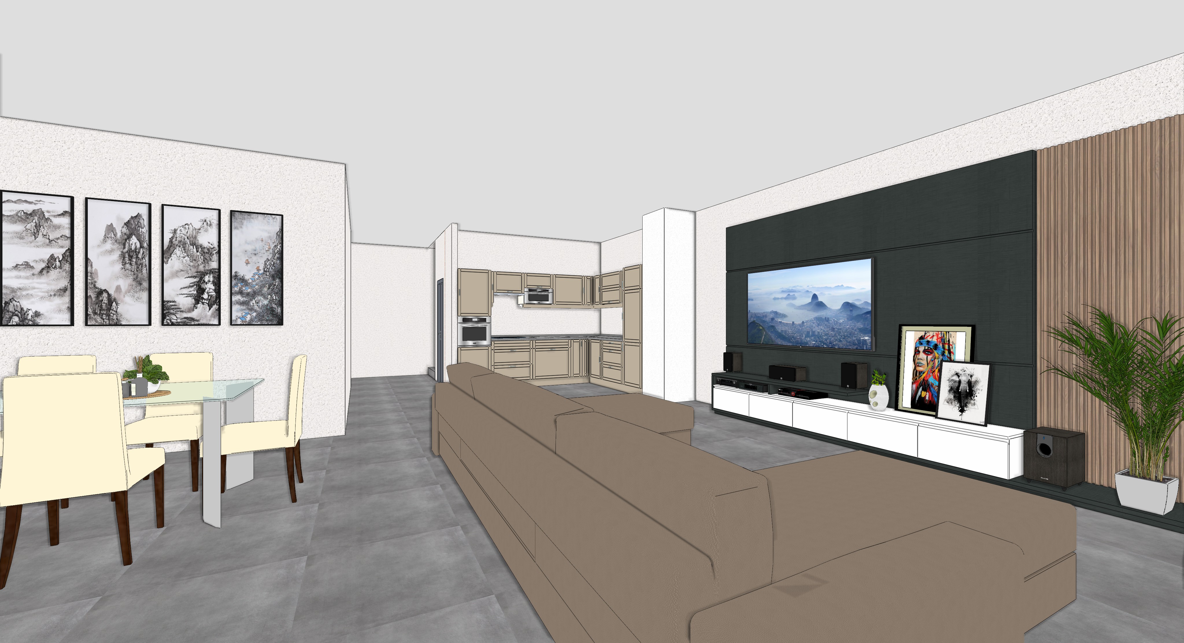 a modern elegant living room with a large brown sectional sofa as the focal point the walls are a soft white creating a bright and airy atmosphere the floor is covered with sleek light gray tiles that add a touch of sophistication a long dark green entertainment unit houses a large flat screen tv displaying a breathtaking landscape two framed pictures and potted plants add a personal touch the dining area features a glass table surrounded by cream colored chairs with dark wooden legs adding warmth and contrast large windows allow natural light to flood the room enhancing the contemporary and inviting ambiance