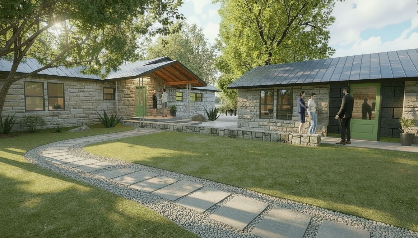 keep photo exactly as is except please change the far end of the left building the large stone that is furthest from us to the charcoal color that is shown next to the sides of the green door