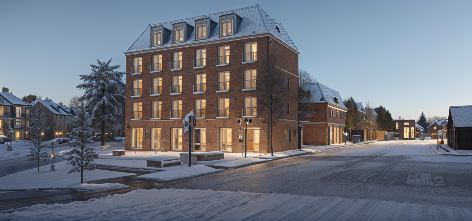 nordic exterior shot keep building as close to original as possible it is a light brick building a cafe in the ground floor with lights in some of the windows nordic light architecture