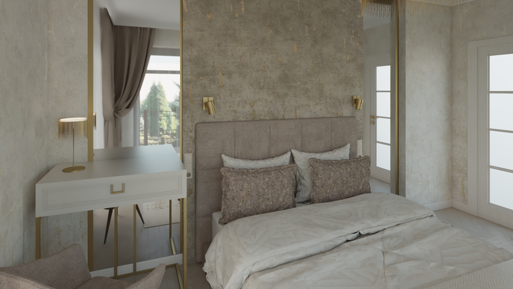 enhance the existing interior visualization by adding natural realistic light reflections and subtle highlights improve photorealism through accurate lighting soft shadows and gentle light gradients maintain all original colors textures materials furniture decor and their exact placement do not alter the composition design or geometry of the scene focus solely on realistic light behavior depth and atmosphere as in a professionally photographed interior