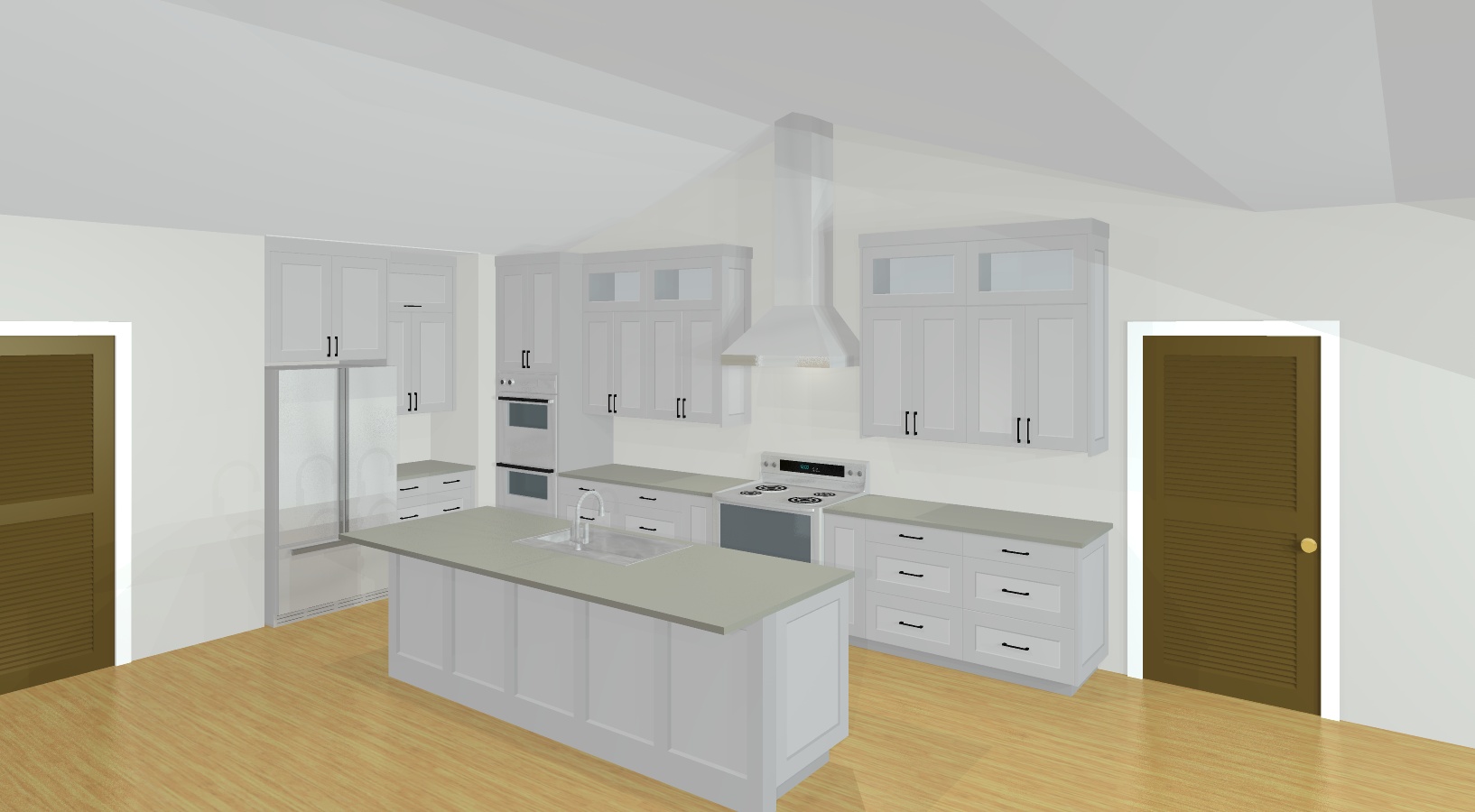 create a beautifully rendered kitchen interior featuring elegant modern design the walls are painted in a soft warm white color creating an inviting atmosphere the cabinetry is detailed with a light oak wood for a sleek contemporary look complemented by matte black handles the countertops are a smooth stone gray offering a perfect contrast the floor is a warm natural oak wood adding a touch of warmth and coziness to the space the oven and refrigerator are stainless steel reflecting light subtly and adding a touch of sophistication the doors are a rich earthy brown providing a striking contrast against the neutral palette the scene is softly lit emphasizing the clean lines and modern elegance of the kitchen design