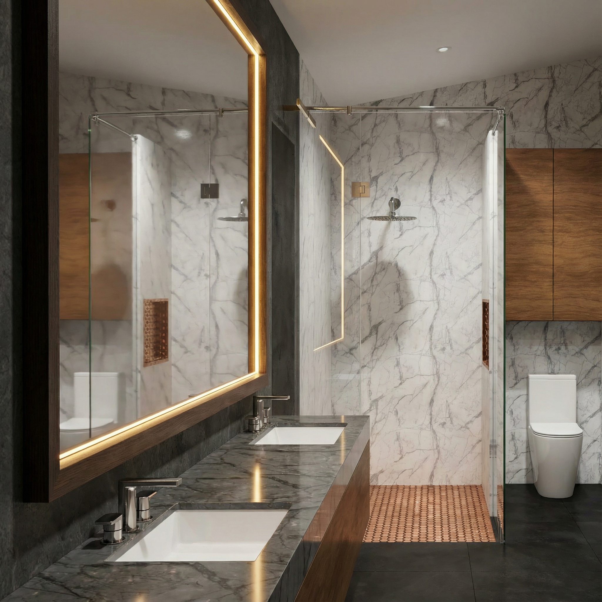 the shower floor is a beautiful shinny copper penny tile the wood finish has a nice wood stain that has the natural orange tone of the wood and the countertops are a white marble to match the shower walls