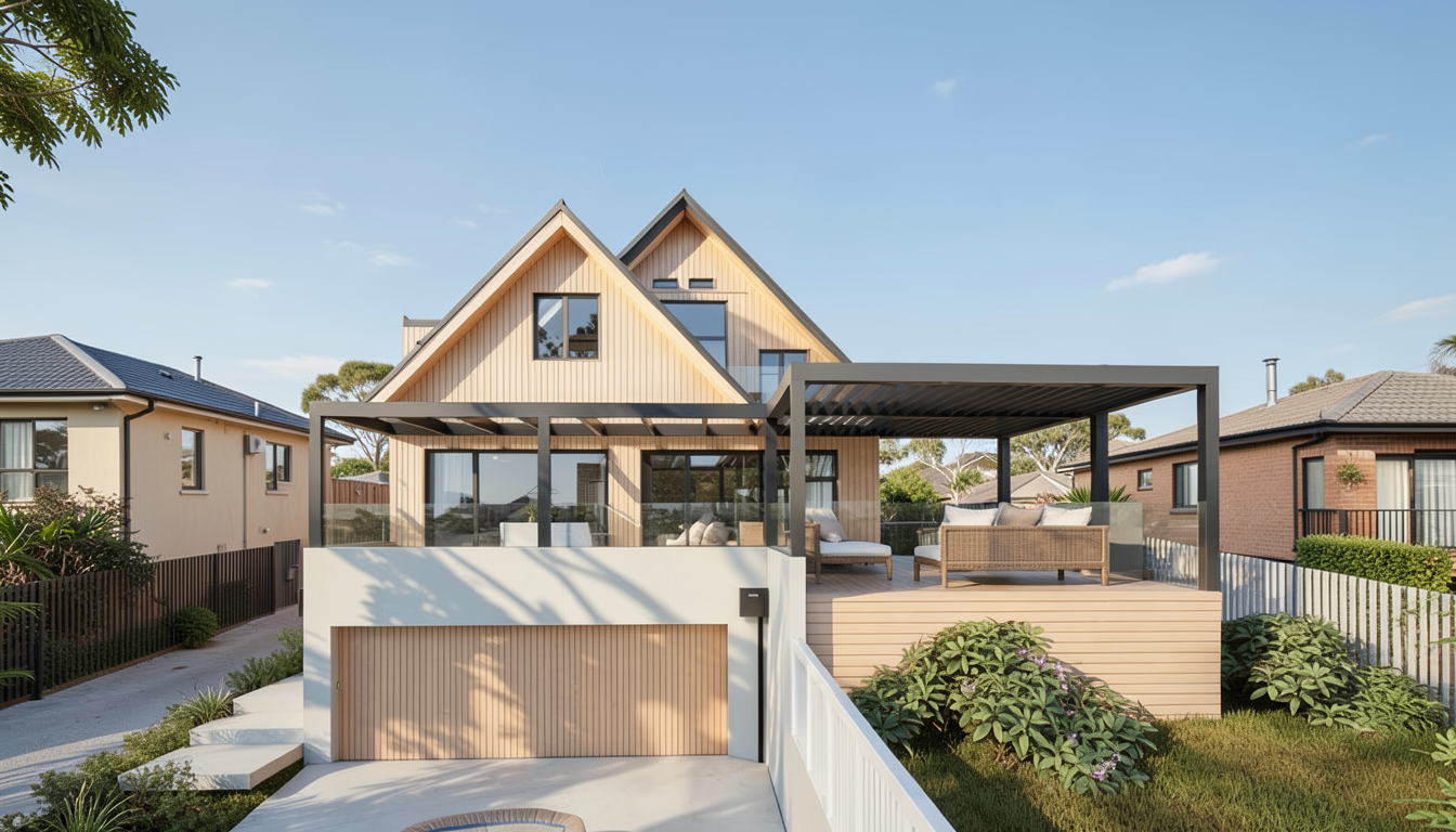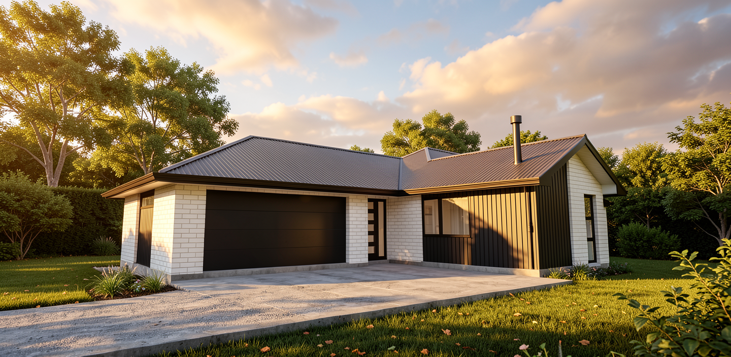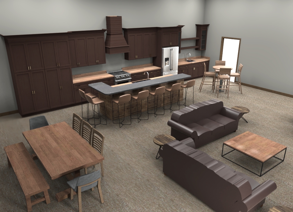 hunting lodge with black ceiling gray epoxy floors leather sofas mocha stained oak cabinets add deer and duck mounts to walls do not alter the layout in any way there are framed doorways on each side of the dining table and windows on each side of the fireplace soft interior lighting magazine look image