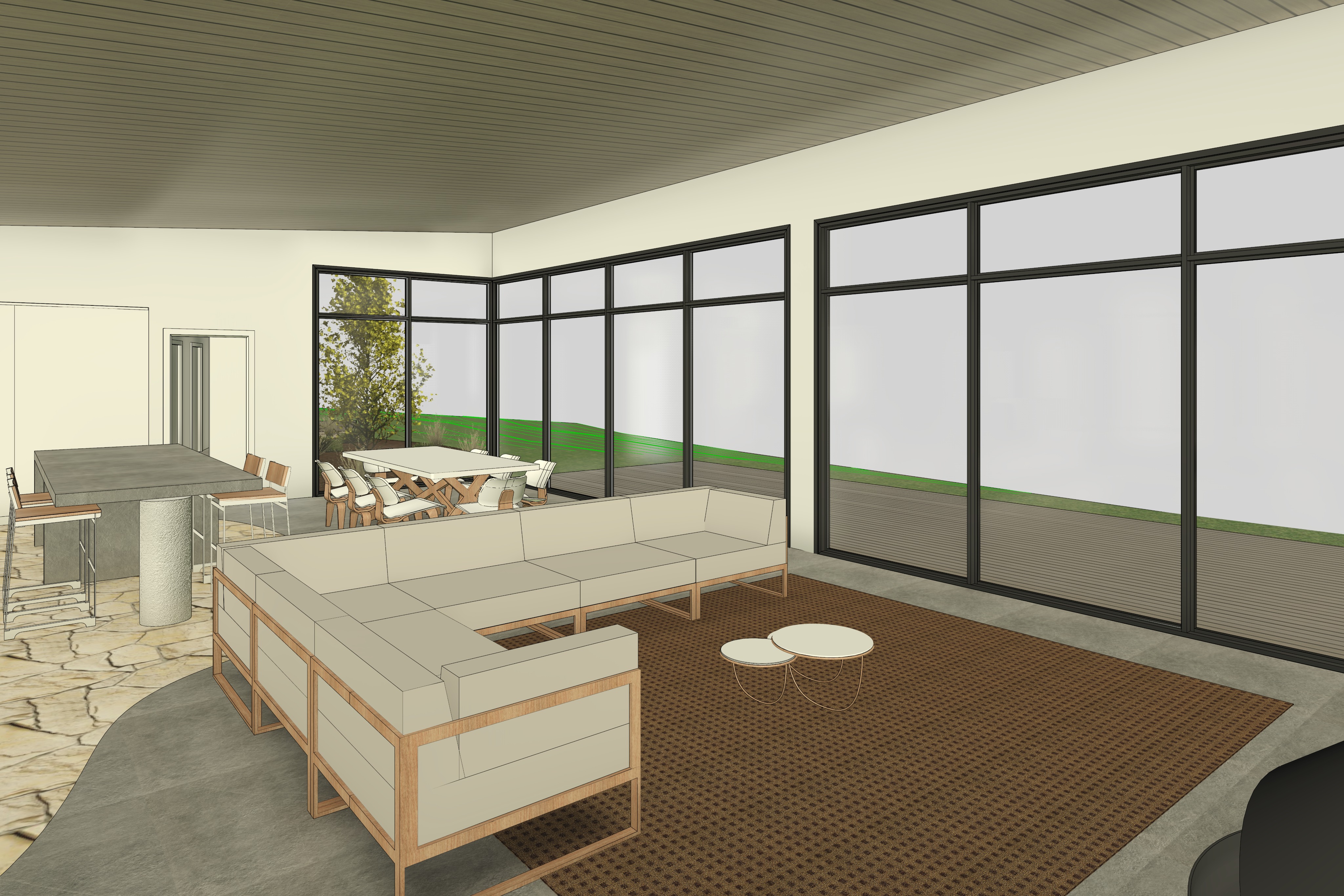 keep exact geometry of original image internal of a living dining kitchen area of a residential home floors are burnished concrete with a feature portion of crazy paved stone through the kitchen with an organic edge divide grey fabric couch with timber frames black window frames timber ceiling lining all timber to be color matching mulch garden beds with native australian grasses and shrubs feature coastal banksia trees where visible decking outside windows to the right grassland surrounding house with distant bay water views down hill partly cloudy sky with warm mid morning sunlight from the right hand side on a fall day kitchen to the left hand side with concrete benchtop and support bench in front of window along side tv to have base cushions only to make a window seat flame in fireplace concrete bench top in kitchen full height white door into walk in pantry on right hand side of image