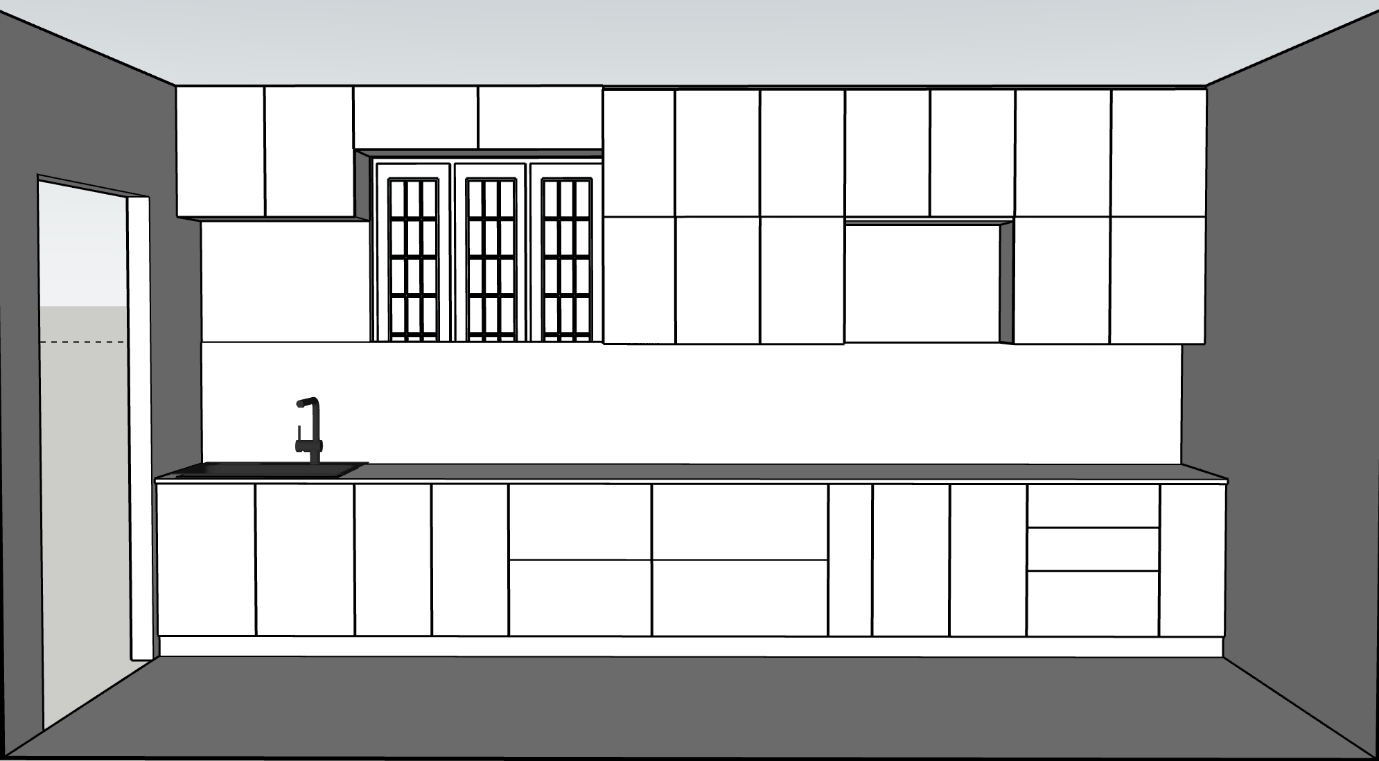 interior shot moder indian kitchen with half white and light wooden shade for all the cabinets black granite counter top light brown color wall tiles with modern pattern black coloe profile handle for all the shutters 4 burner stove and chimney needs to be added