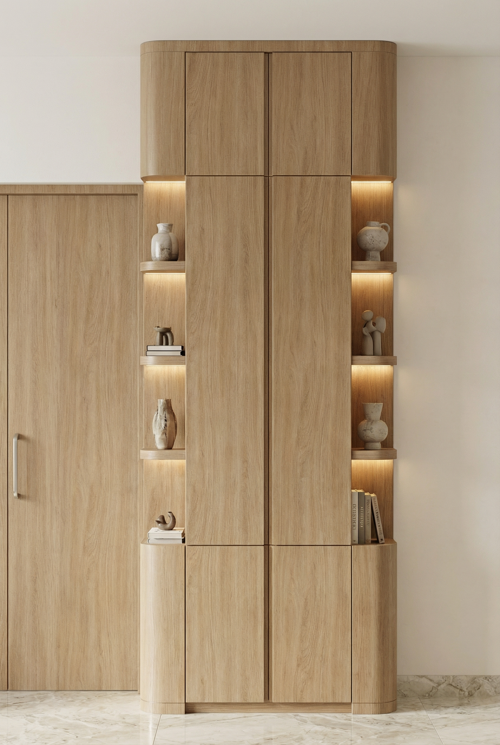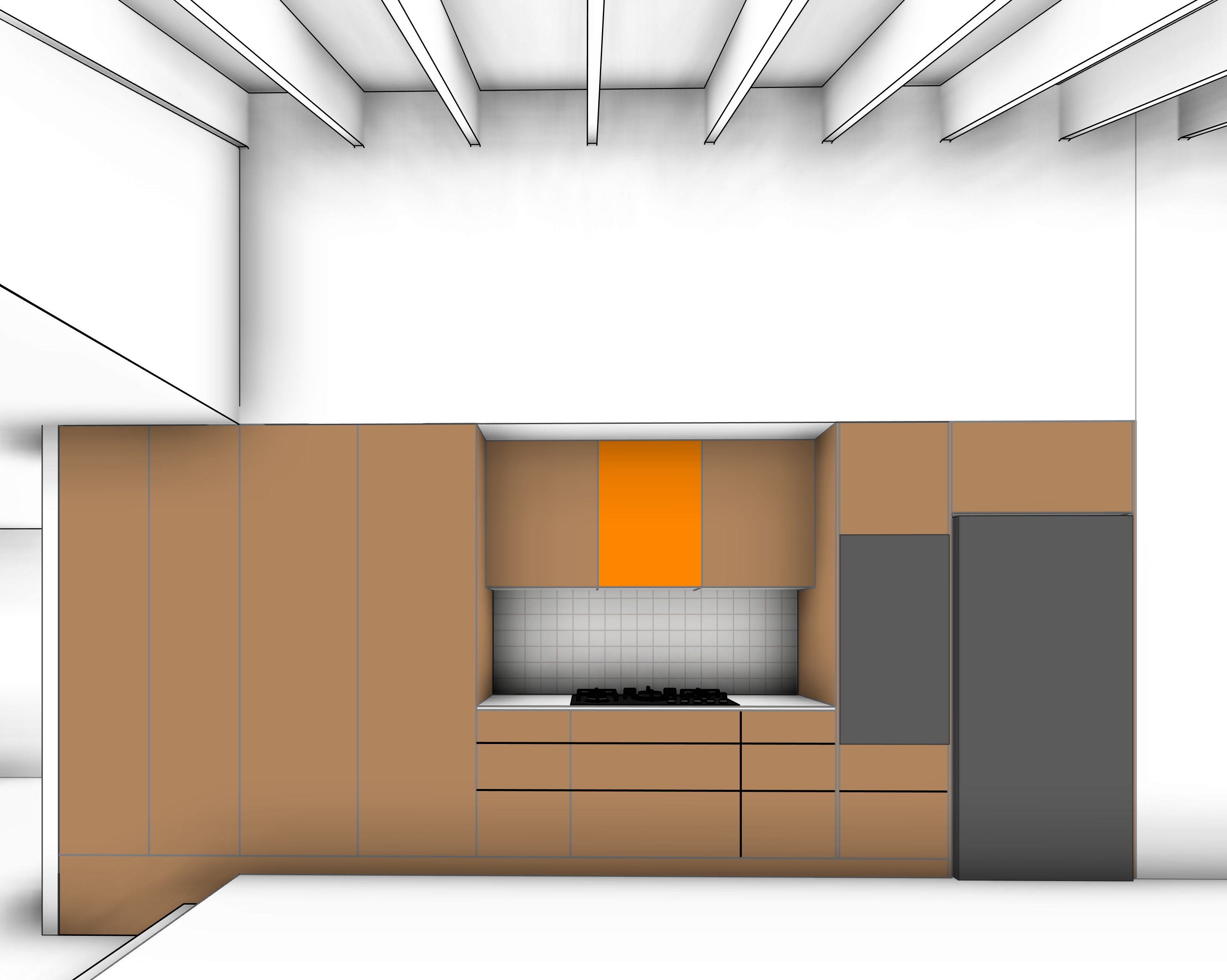 a warm contemporary kitchen interior with joinery in rich timber veneer minimal visible hardware rendered in soft natural daylight the space features clean rectilinear forms warm white walls and a light toned subtly veined stone benchtop and splashback that adds refined texture without dominating the composition vintage copper hammered rangehood cover and a few restrained styling elements such as a vase with greenery to bring life to the scene while keeping the overall look uncluttered and sophisticated the floor is a greige concrete look large format tile emphasise high end materials precise detailing and a calm inviting atmosphere suitable for a client presentation with a high resolution photoreal finish and a slightly elevated camera angle that shows the length of the cabinetry and the connection to the adjacent living space remove all text from the image