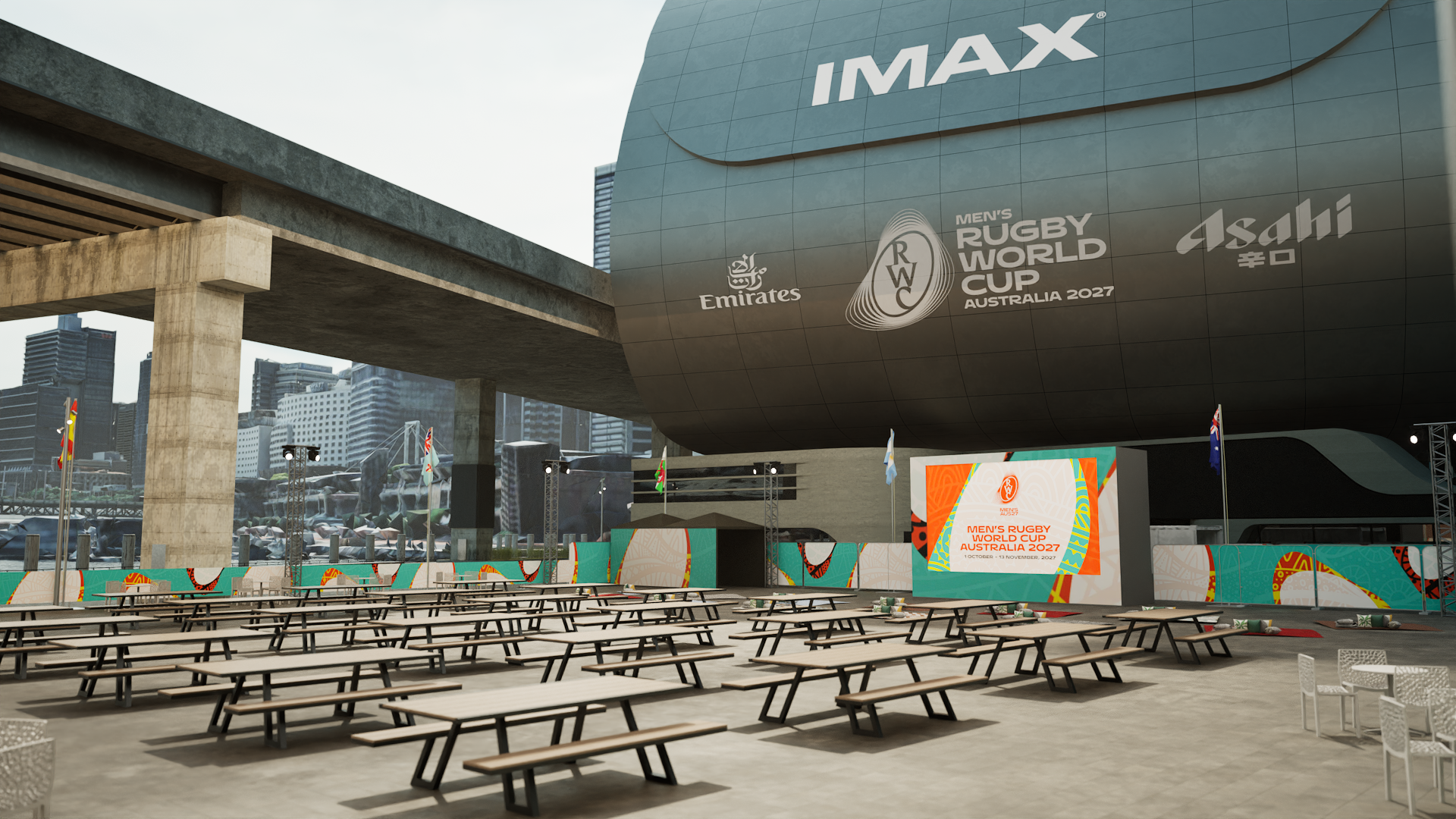 add a mix of 100 people cheering towards the screen include food and beers on the tables make the background a warm sunny day