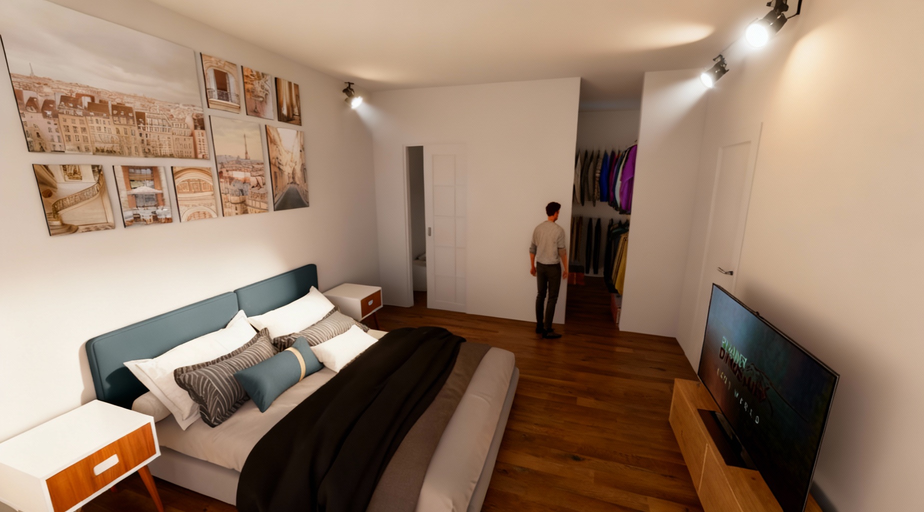 interior shot render the atrium as a luxurious civic showcase maintaining the original structure and camera angle use polished travertine flooring and clad the cylindrical columns in metallic emerald mosaic tiles add brass sconces and refined lighting elements throughout project a cinematic dubai skyline on the ceiling between the escalators in the center place a sculptural raised dubai city model with glowing led pathways on a curved brass platform on the right design a high end caf with arched emerald green entry lush planters and elegant seating include emirati figures men in kanduras women in abayas children observing the model to create a poetic immersive spatial story that reflects cultural belonging and urban aspiration
