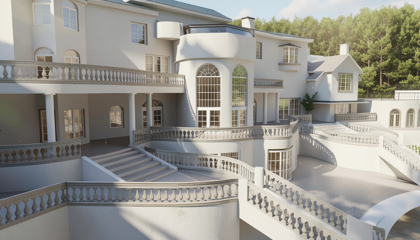 blue area tennis court brown slate roof some architectural landscape couple trees in the background area around blue acrylic resin painted green
