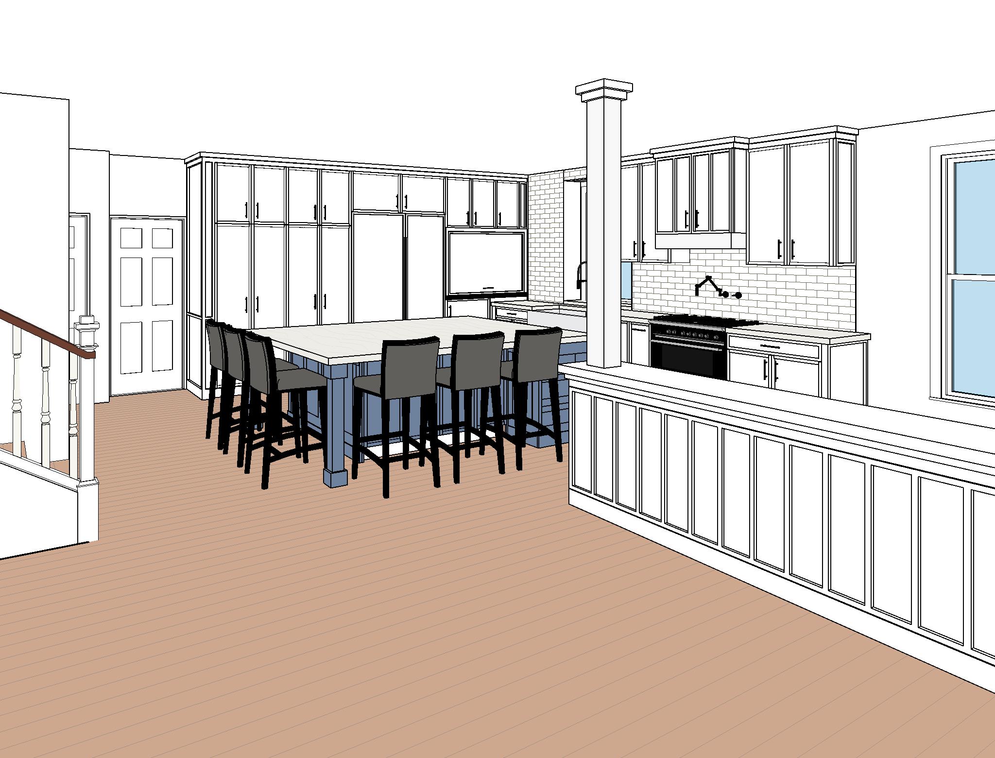 white shaker cabinets with small classic detail white built in and column blue island black chairs with grey fabric oak floor cabinets to ceiling simple casework details black cabinet pulls black range hidden refrigerator
