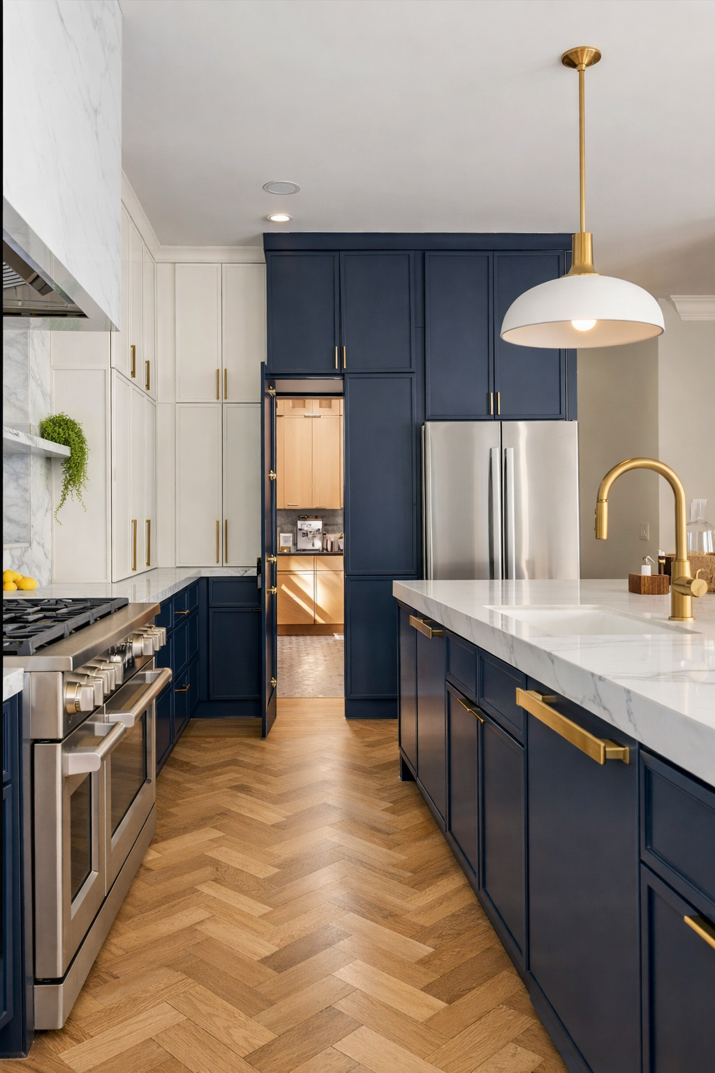 photorealistic interior render of a modern luxury galley kitchen same layout and camera angle as the reference image transform the entire material and color palette into a warm contemporary style cabinetry in soft matte taupe and light oak veneer flat panel doors with minimal shadow gaps replace hardware with brushed champagne bronze slim bar handles countertops in light travertine or taj mahal quartzite subtle beige veining slightly rounded edge profile kitchen island base in textured warm wood veneer matching the tall pantry cabinets flooring replaced with wide plank natural european oak flooring warm matte finish with subtle grain variation backsplash in large format limestone slabs soft creamy tone with minimal seams for a clean modern look replace faucet with a curved brushed brass gooseneck tap with pull down spray replace pendant light with a modern sculptural pendant in brushed brass and frosted glass soft warm lighting lighting should feel natural and bright soft daylight entering from the adjacent room realistic shadows and reflections high end architectural photography style add subtle styling minimal ceramic bowl wooden cutting board olive oil bottle neutral kitchen accessories ultra photorealistic soft global illumination realistic materials architectural photography 35mm lens high dynamic range natural color grading