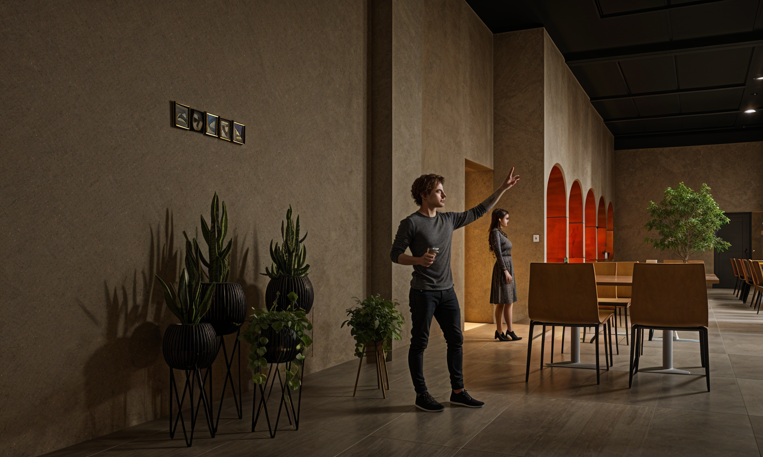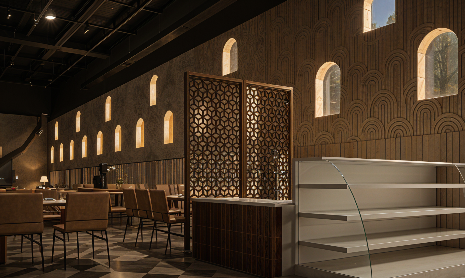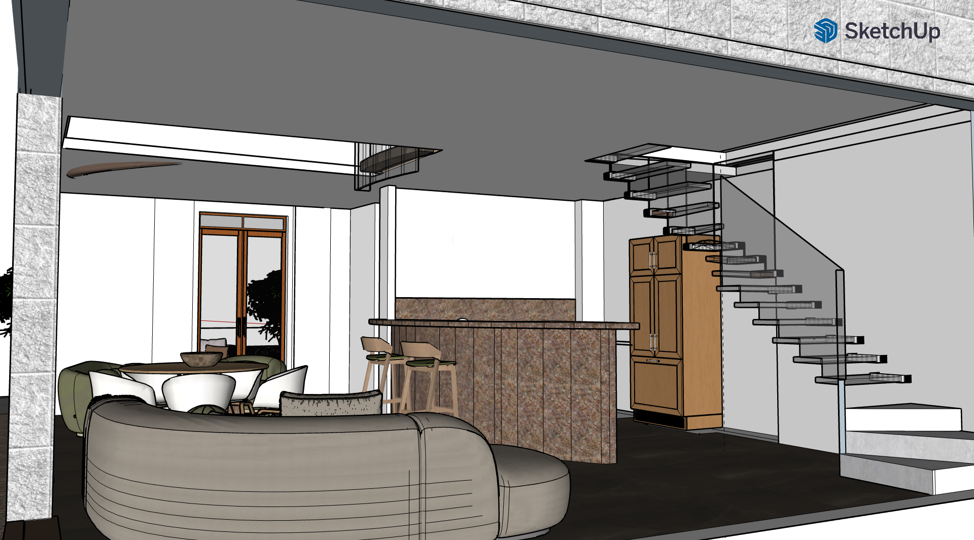 interior shot glass floating stairs and steps curved edged bar equal to the curve of the ceiling void keep the shape of all objects colour theme of furniture is neutral earthy tones white walls stone table tops floor to ceiling window