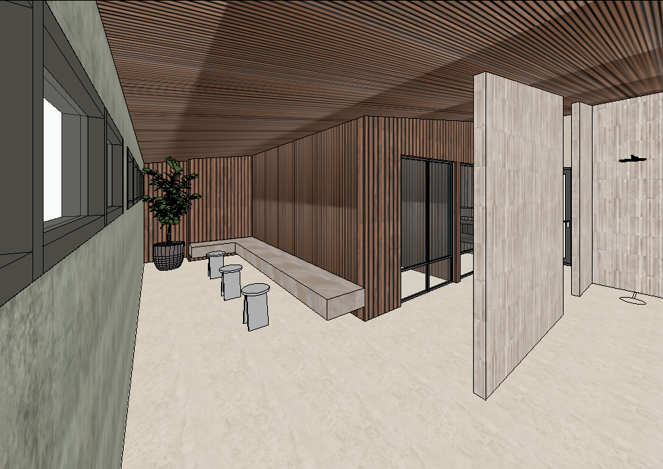 fig tree in black pot beige tiles on wall and floor lighting added