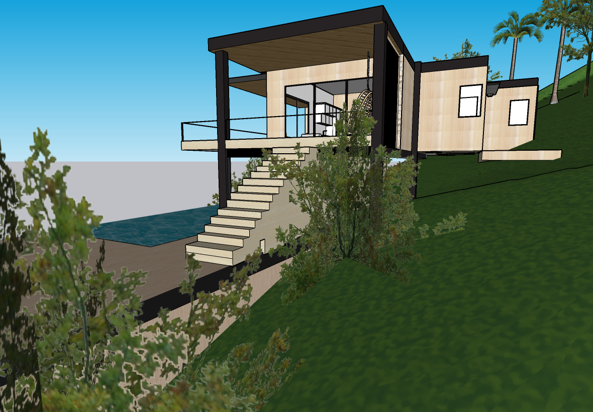 modern hillside house with ocean view with a sleek minimalist design featuring a light beige and natural light wood facade the structure is elevated with black metallic beams surrounded by lush greenery and elegant palm trees the stairs are a soft cream color leading to a spacious terrace overlooking a serene blue infinity pool a bright clear sky enhances the vibrant and tranquil atmosphere the mood is modern peaceful and luxurious