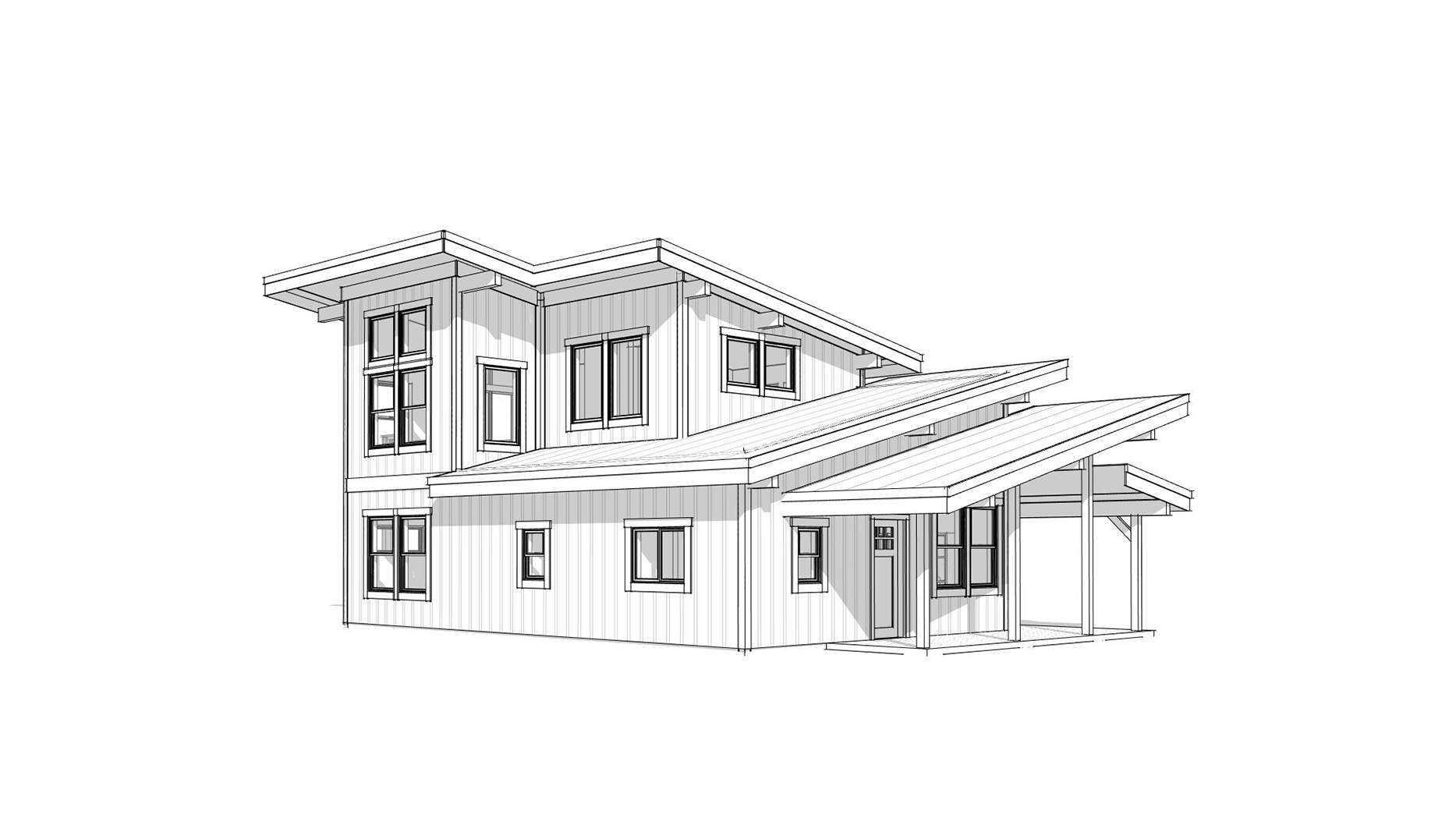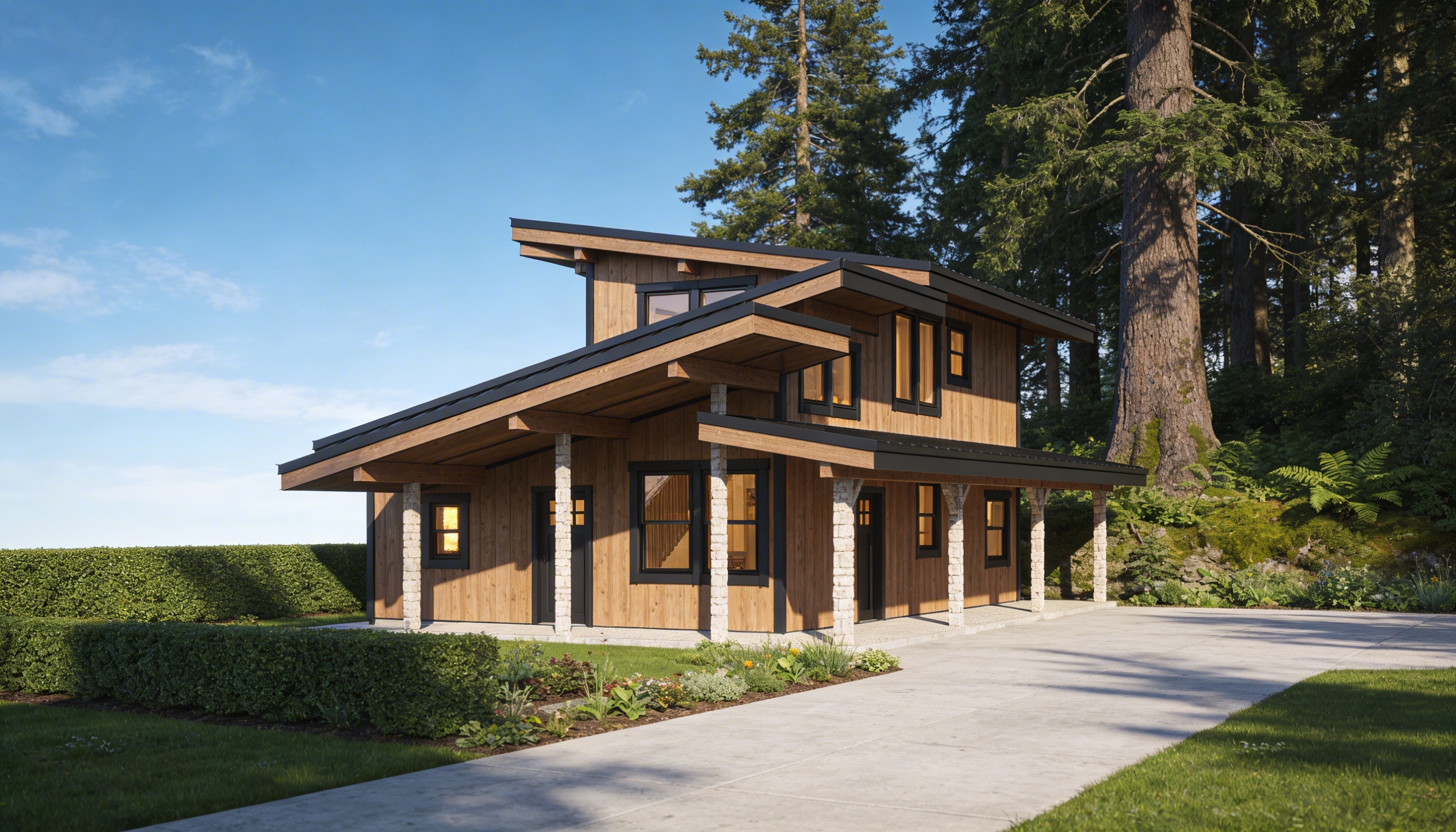 clean modern cabin architectural exterior home rendered in cinematic vibrant daytime lighting with blue skies and sparse clouds in the sky warm glow and reflections off of the windows rustic select grade wood cedar siding green manicured landscape around structure with hedges and gardens and patches of grass concrete driveway leading up to the cabin black standing seam metal roof prominent cinematic forest with big fir trees and ferns and moss surrounding behind the house in the background high fidelity photorealistic visualization crisp shadow falloff refined facade geometry soft atmospheric depth premium architectural photography mood ultra clean composition and materials dark trim around windows