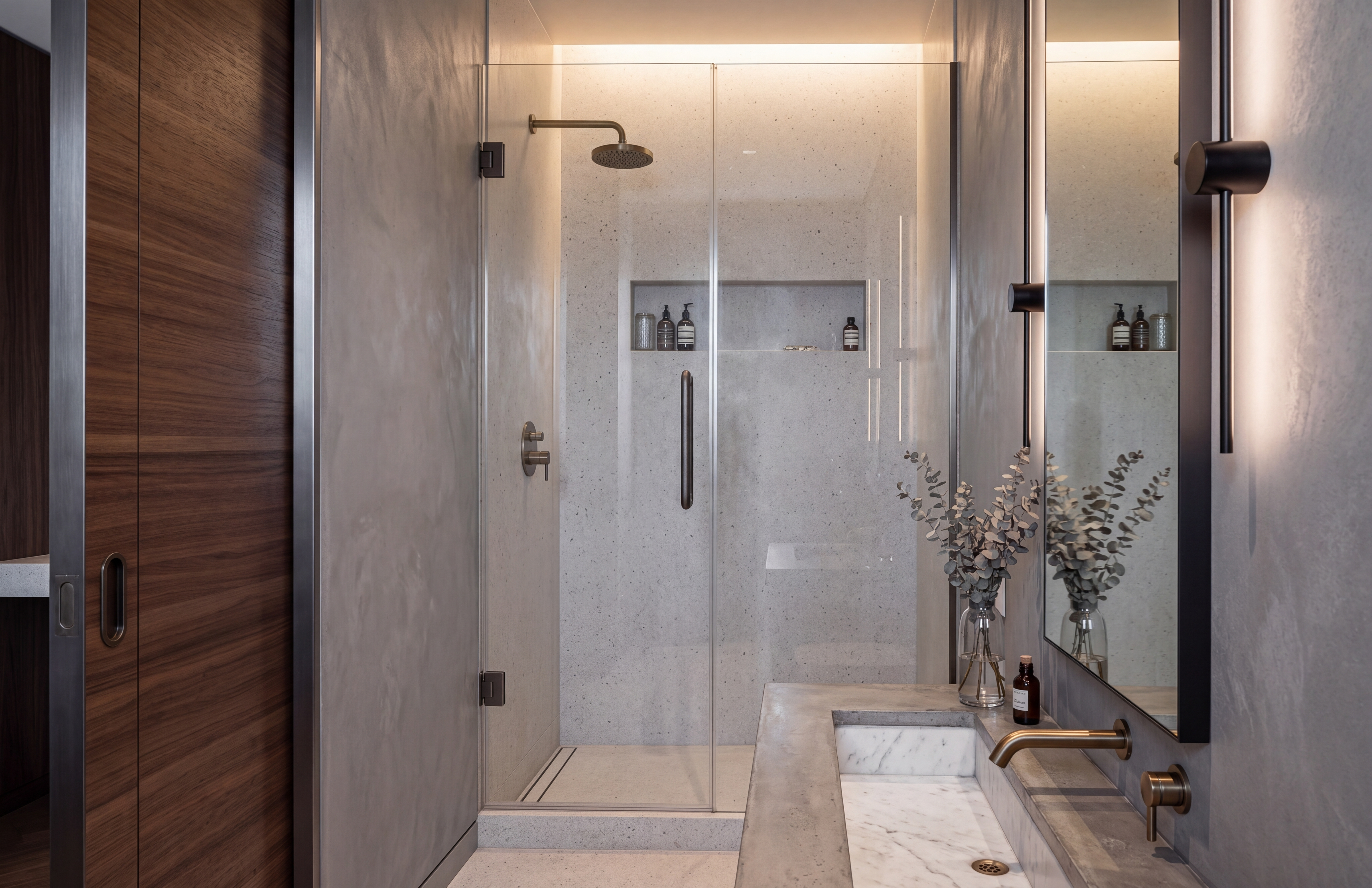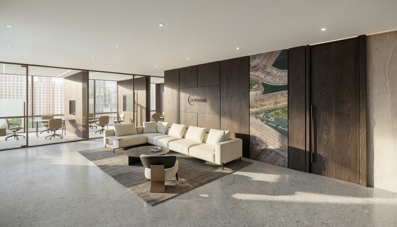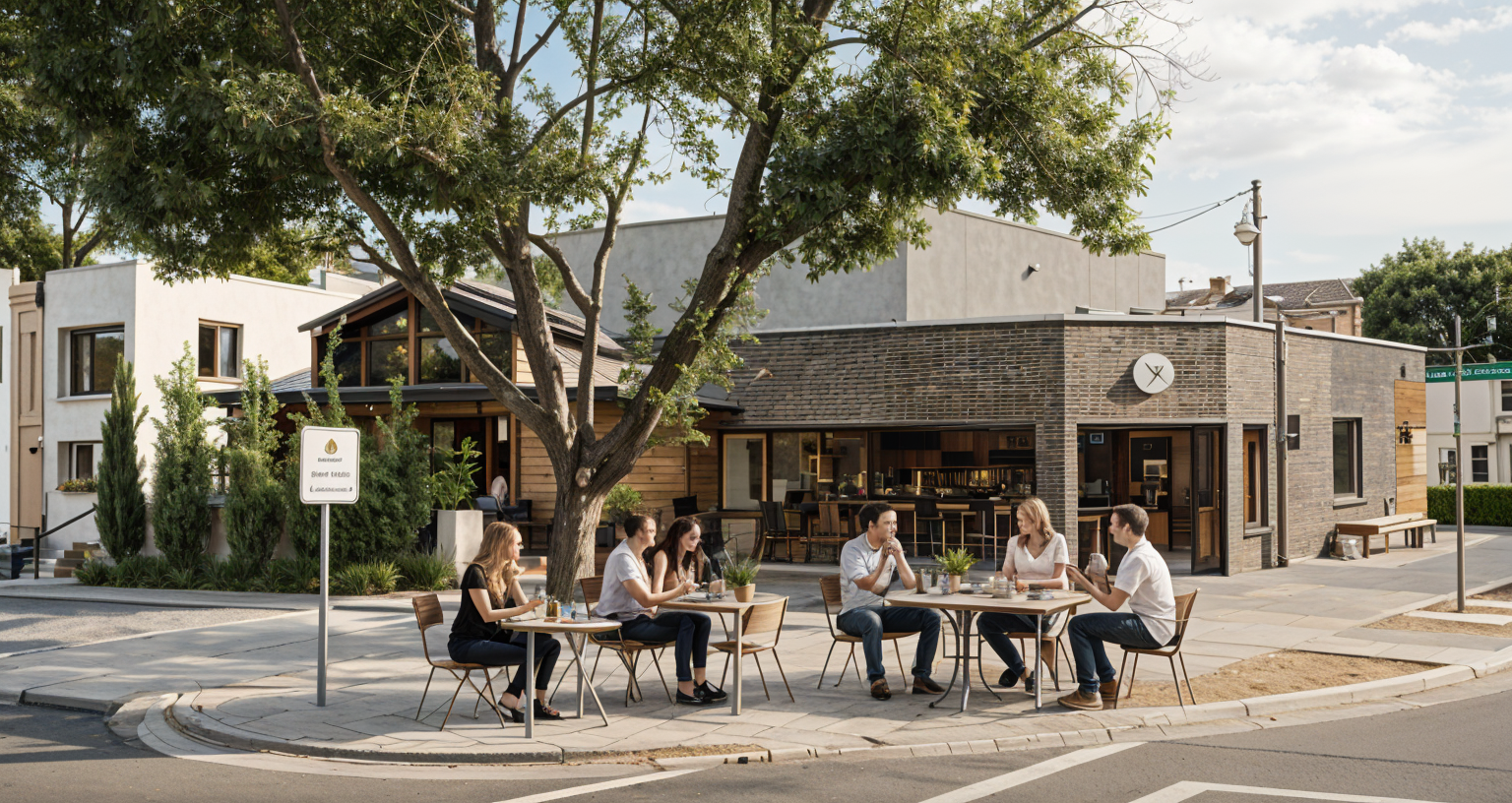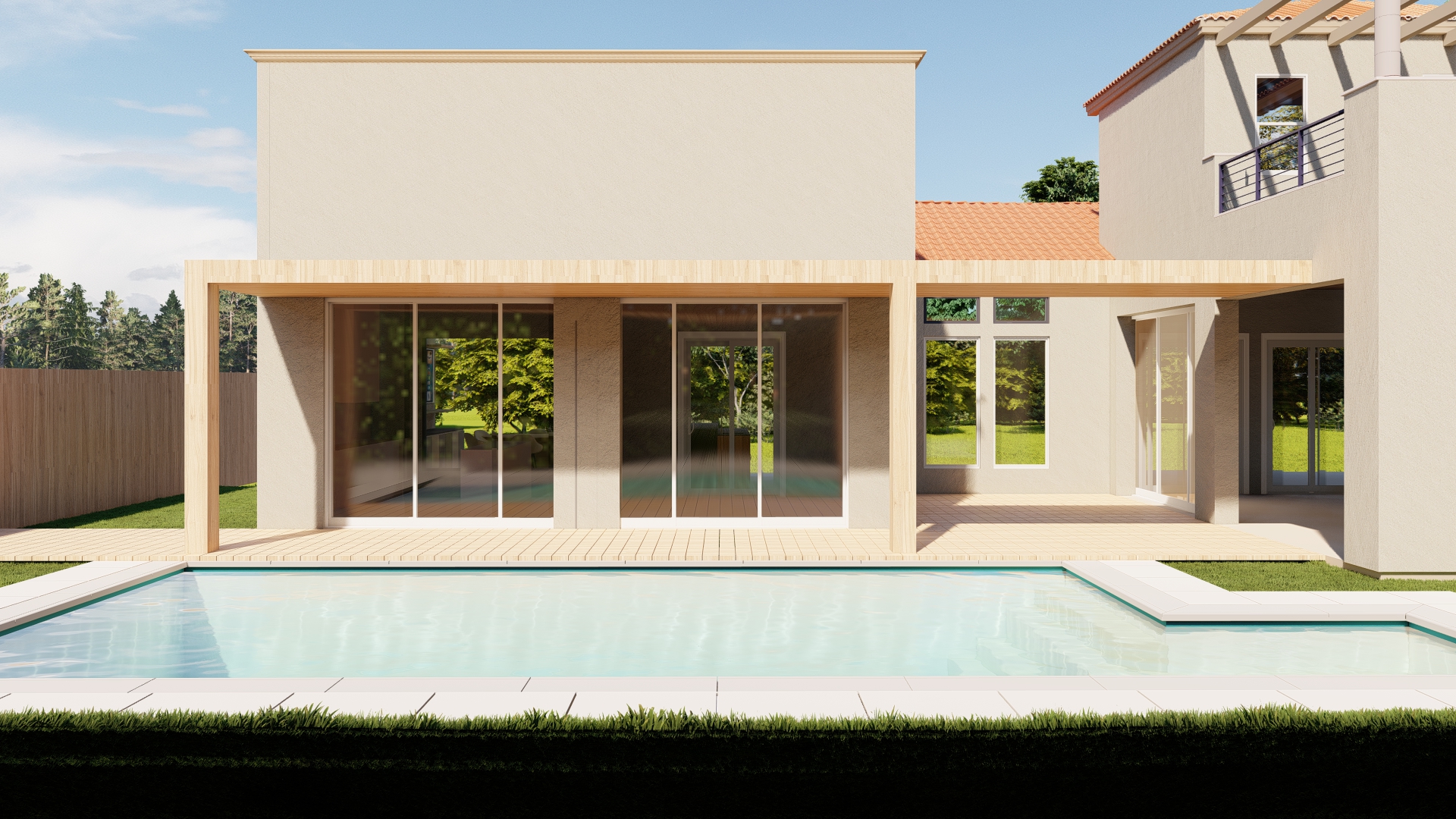 hiperrealistic architectural render of a modern house featuring an exterior wooden canopy structure the canopy is supported by solid natural wood columns with visible grain texture and warm tones the design blends contemporary architecture with organic materials large glass windows and clean geometric lines soft natural daylight realistic shadows and global illumination surroundings include a minimal landscaped garden with grass stone pathways and subtle vegetation ultra detailed materials photorealistic lighting high resolution cinematic composition depth of field 8k quality realistic reflections architectural visualization styl