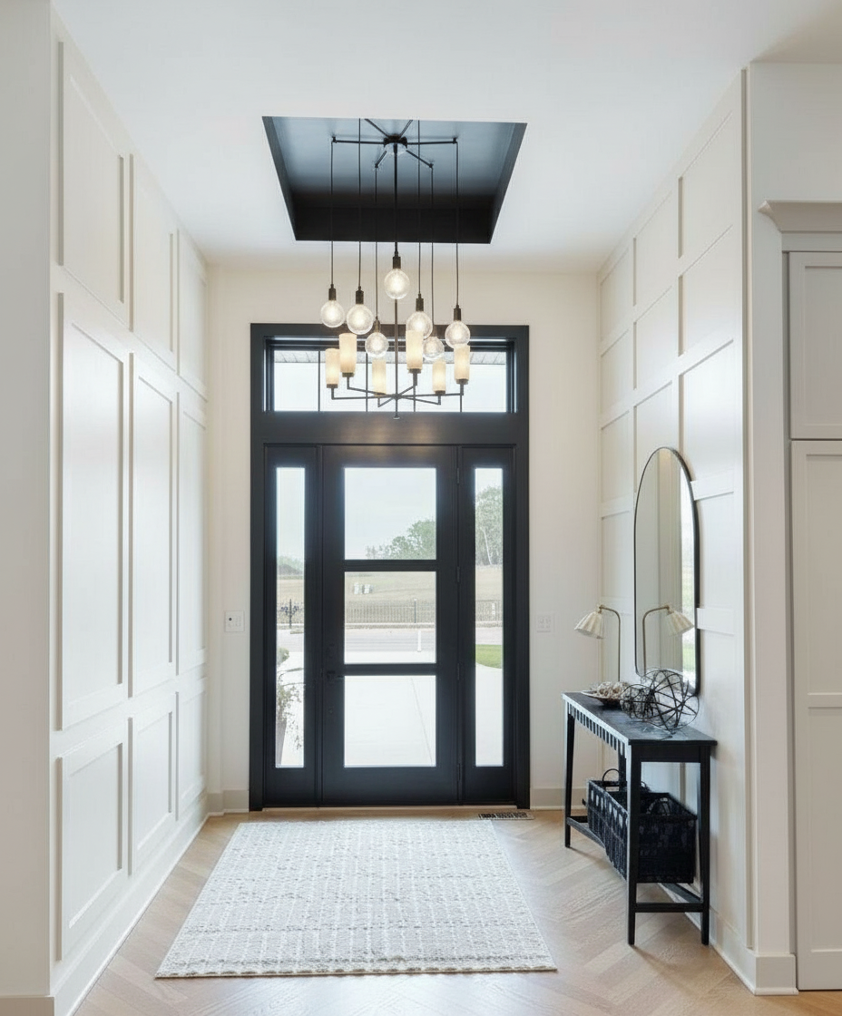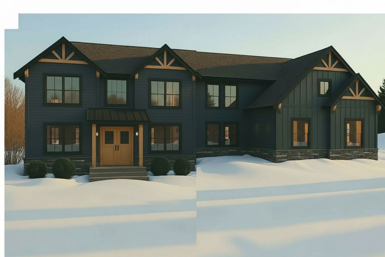exterior shot all dark blue siding black windows with blackm trim snow to look fresh make in the daylight so the house is brighter