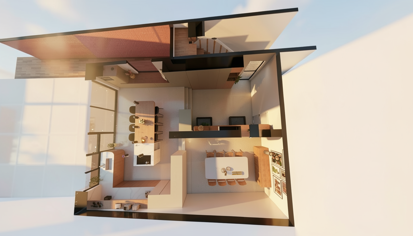exterior shot make a beautiful render of this model colours like they are sunny with clouds tress around the house with no flowers beside the entrance put a modern simple pot with bush on each side architecture