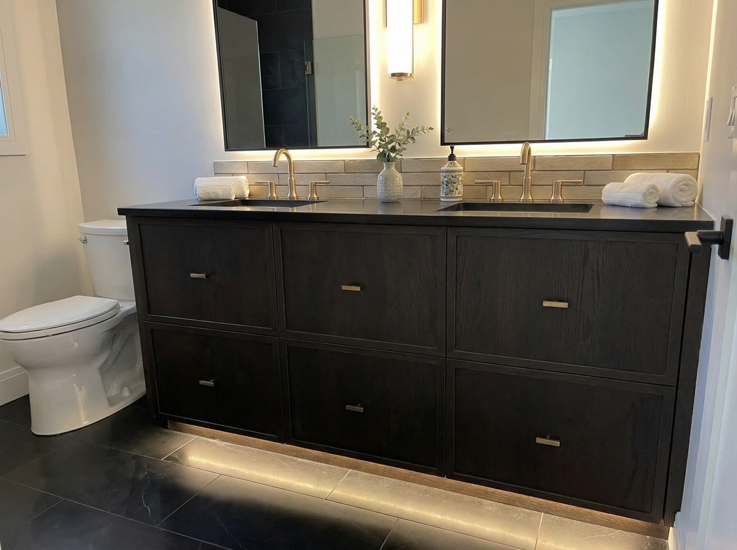 show vanity in timber oak look with grey bench white basins black bench mount mixer taps and grey floor and wall tiles add decor and lighting make mirror an led mirror add a toilet to the right of the vanity change grain direction to vertical