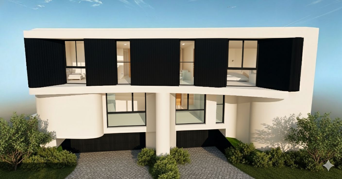 render a modern minimalist house with a smooth white exterior and vertical wooden char timber panels the windows are large and glass capturing natural light set against a clear blue sky the grass is a vibrant green adding contrast to the structure the atmosphere is serene and contemporary with soft natural lighting enhancing the architectural lines