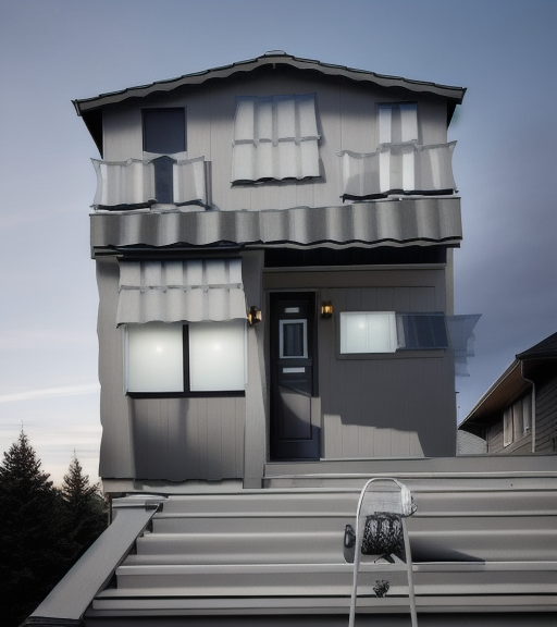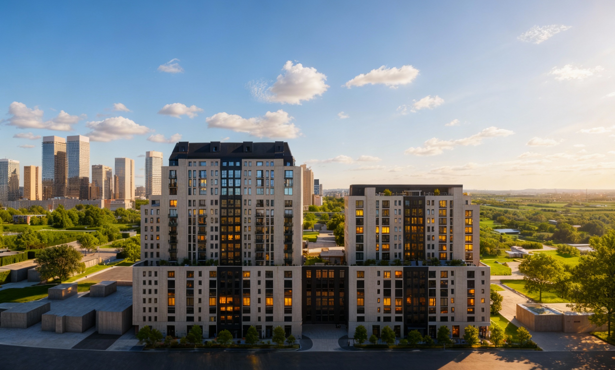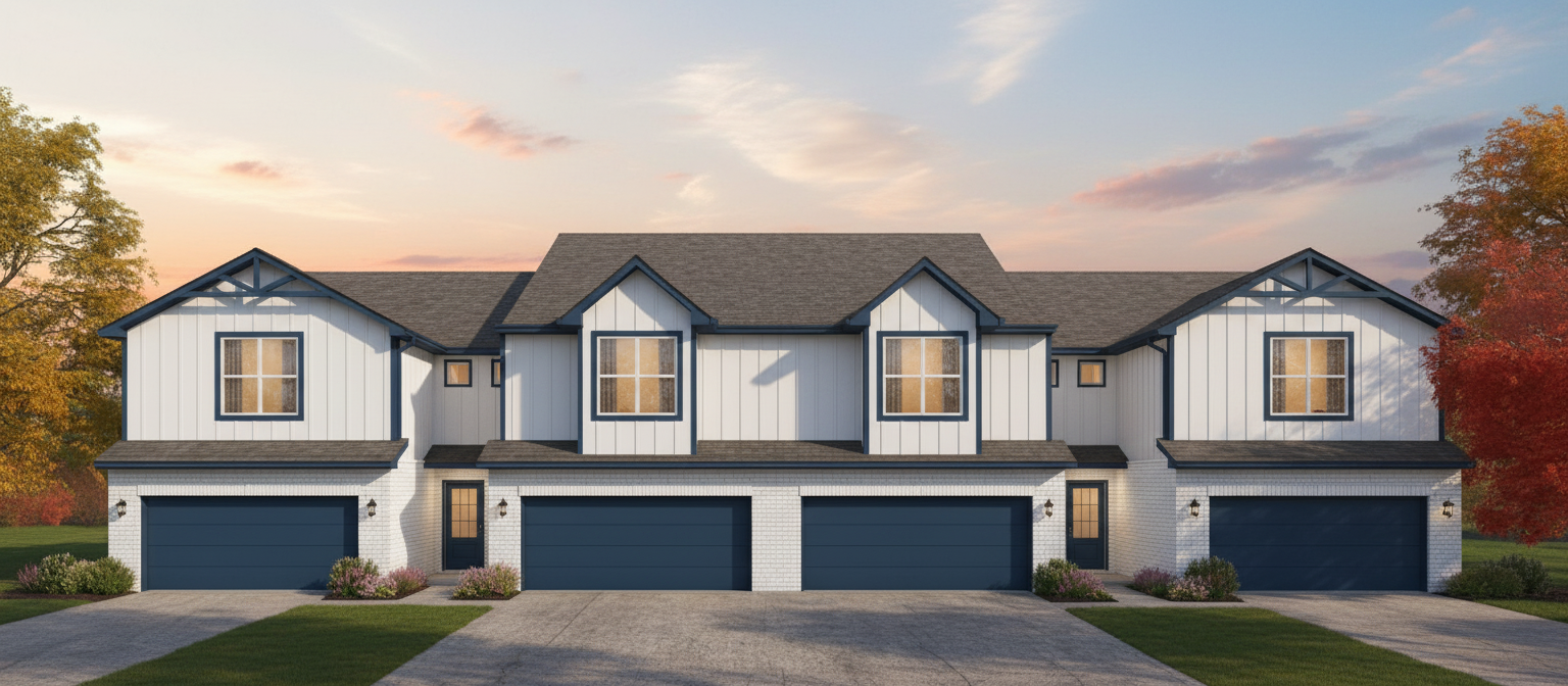 red brick white siding black trim black garage doors sunrise sky lights in windows
