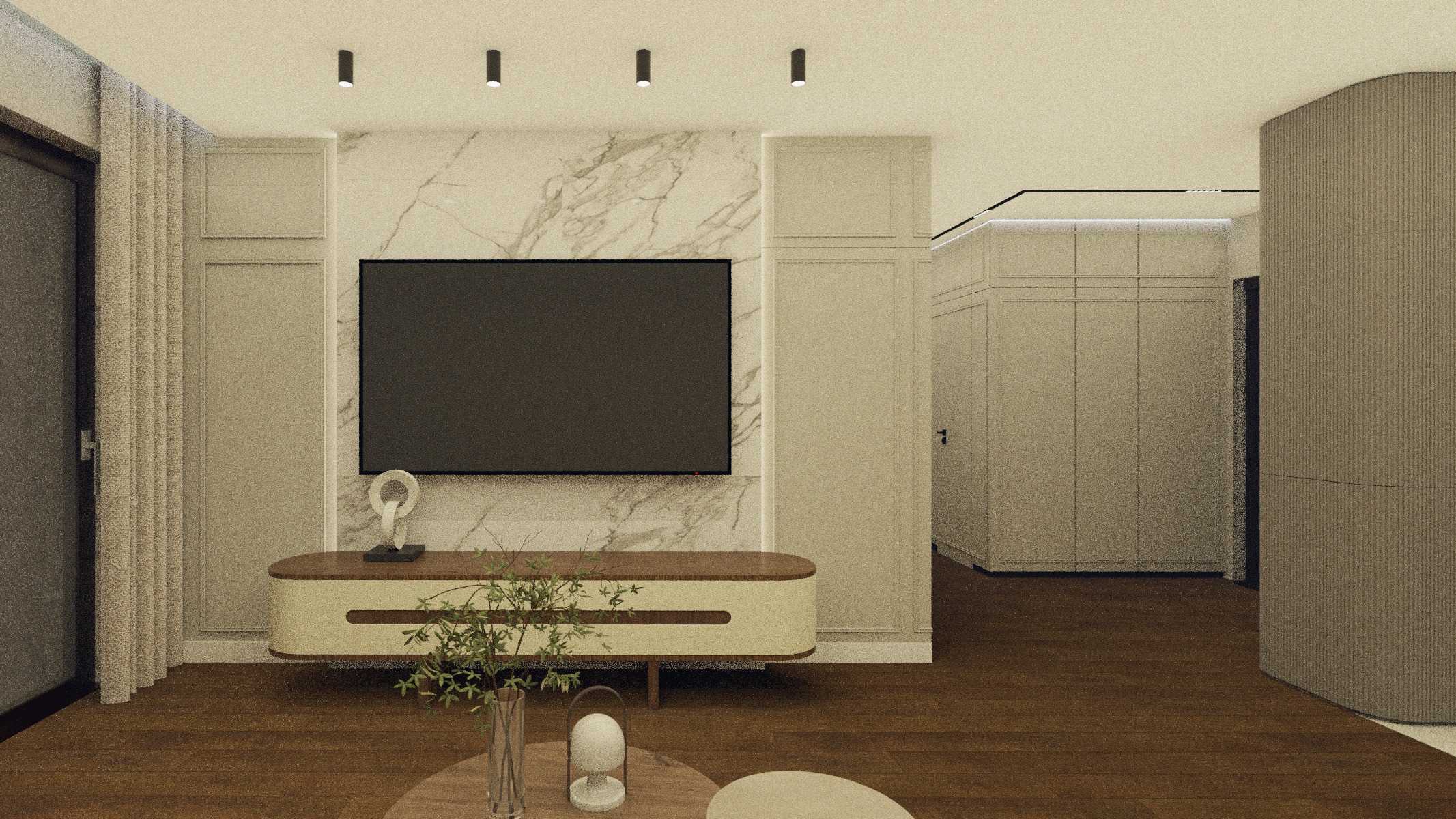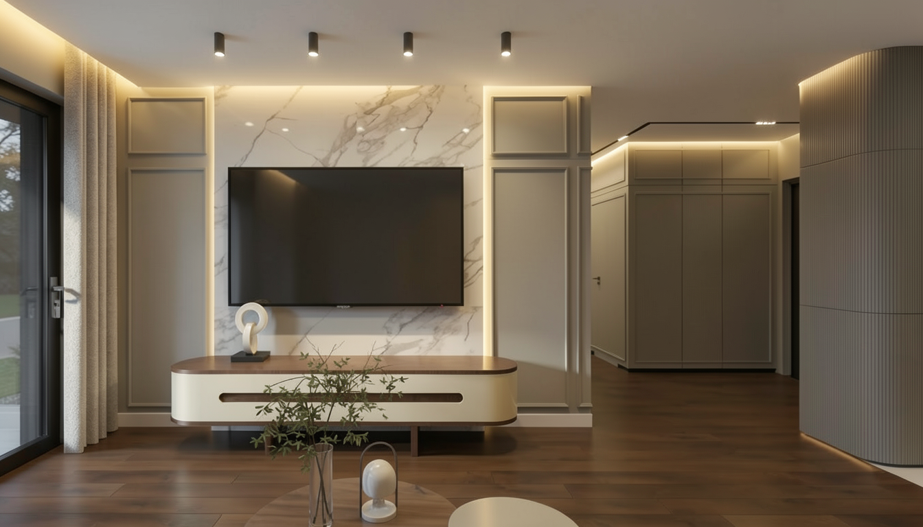 create a photorealistic interior rendering of modern living room preserving exactly the existing camera position framing perspective geometry scale proportions materials textures colors and functions of all architectural and furniture elements do not move resize redesign remove or replace any walls niches panels ceiling surfaces or floor elements only improve rendering quality texture realism and lighting atmosphere lighting enhancements concealed warm led strip lighting 2700k strictly along the ceiling perimeter where it meets the walls the led must be fully hidden in a narrow shadow gap at the ceiling contour and follow the entire perimeter concealed warm led strip lighting along the inner curvature of all three vaulted niches left centre right leds must remain invisible 2700k strictly atmosphere warm elegant mood with soft indirect lighting subtle chrome reflections gentle highlights on wall panels and highly realistic materials add reflections on the glass door on the left outside is urban surrounding not nature