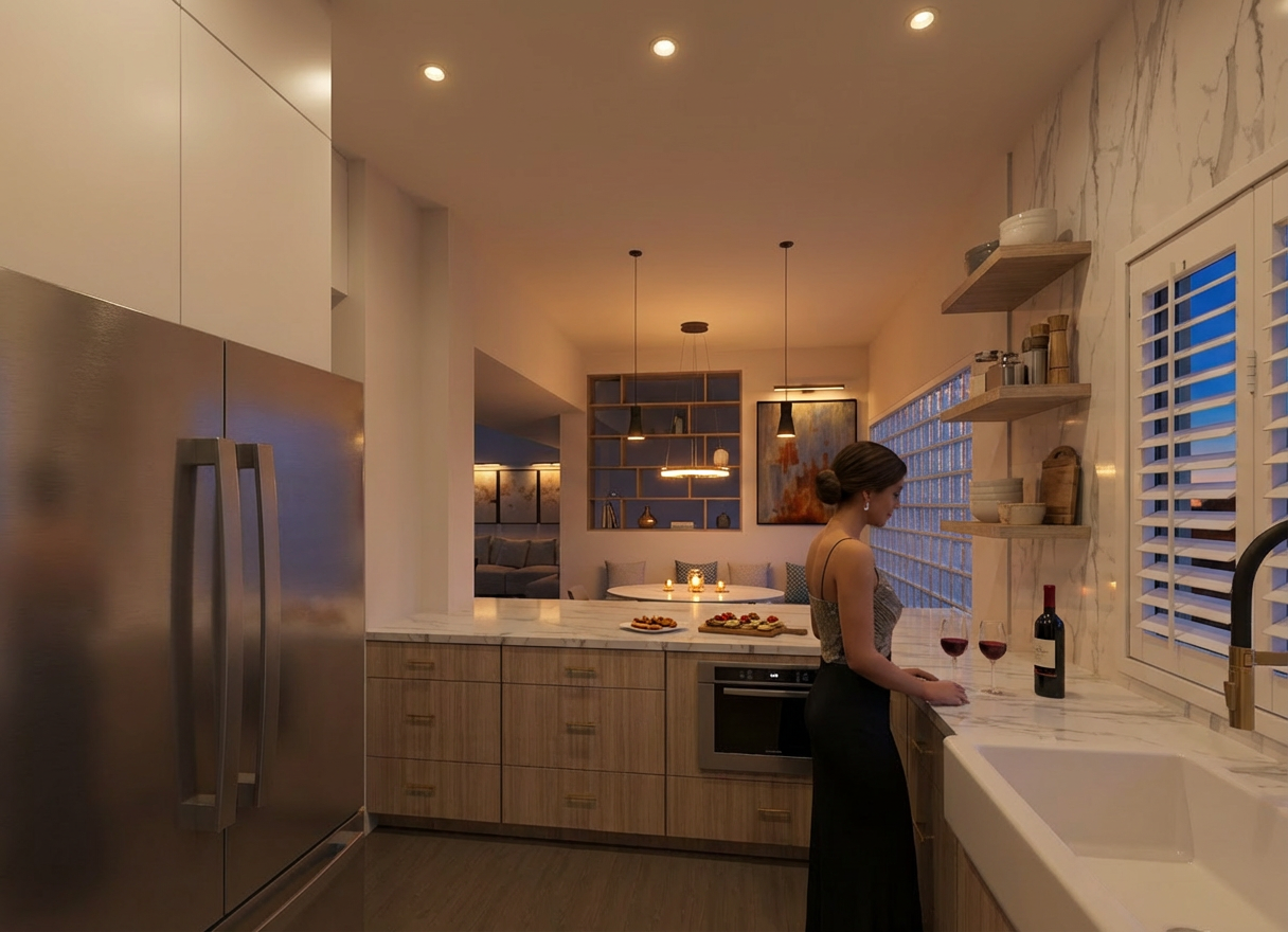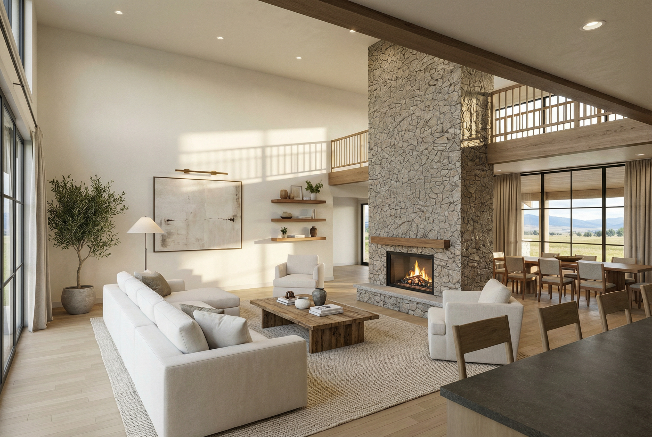 t s important to keep the sizes of everything the same change textures and materials but keep the sizes of everything the same make rock realistic its important to keep to scale this room is big do not change size of windows or doors do not add doors or windows do not change or add fixtures modern warm minimalist interior open living space wide plank white oak flooring soft natural sunlight casting long shadows across floor black steel framed glass partition wall floor to ceiling glass panels with thin mullions neutral color palette creamy white walls light taupe curtains contemporary living room with low profile white sofas warm wood floating shelves with minimal decor plaster fireplace with simple mantle soft ambient lighting large potted indoor tree clean lines high end residential design scandinavian modern aesthetic ultra realistic architectural visualization 8k detail exterior views are western montana furniture should be close to camera remember to not change the scale its very important to keep the sizes the same