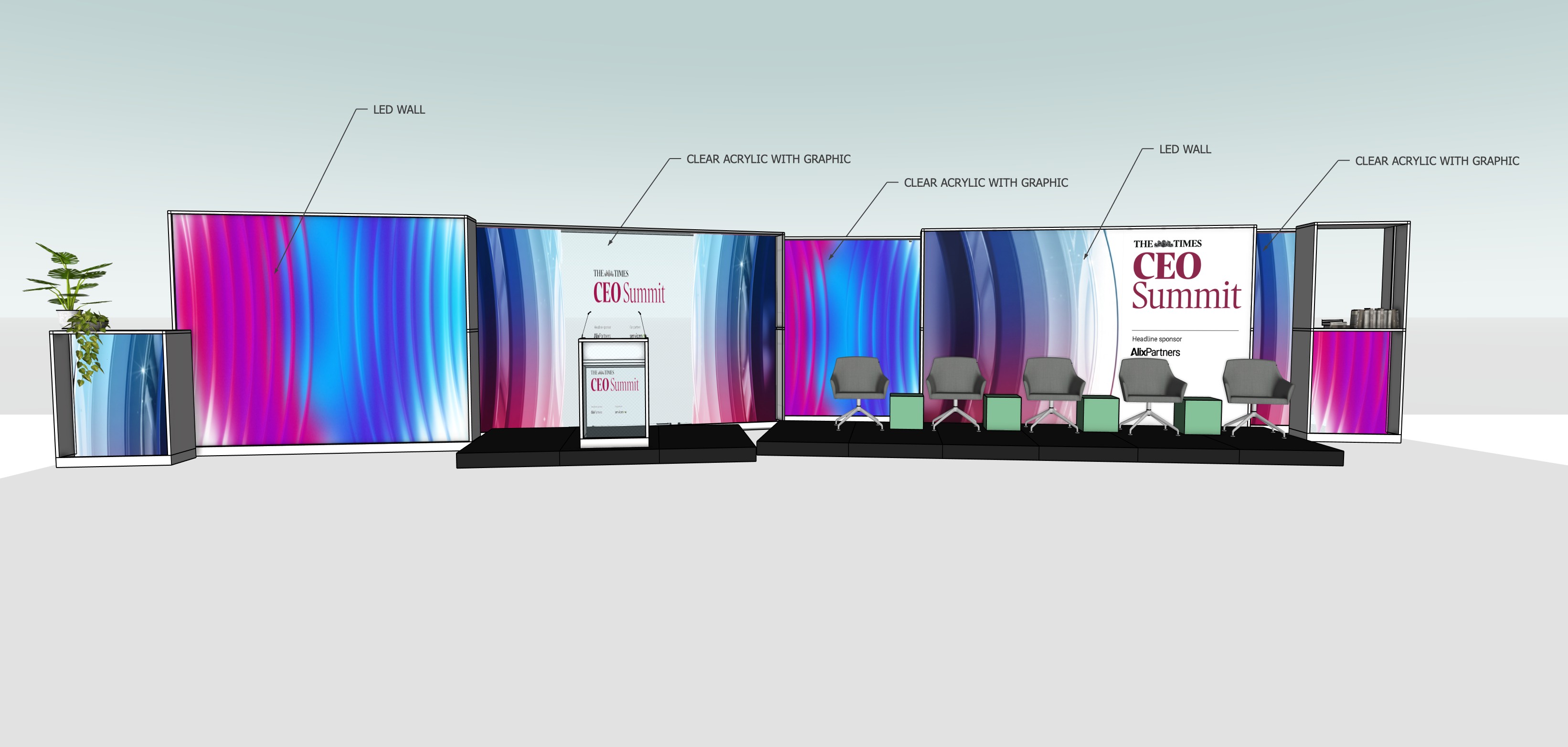 render a modern event stage setup with a futuristic atmosphere the 2 led walls labelled with annoations display smooth gradient waves transitioning from vibrant pink to cool blue creating a dynamic visual effect the podium is placed centrally made of clear acrylic exuding elegance surround it with sleek dark gray chairs 2 black stages include lush green plants for a touch of nature and ensure the lighting enhances the overall ambiance with soft white highlights the overall look should be professional yet inviting perfect for a high profile summit remove all annotations