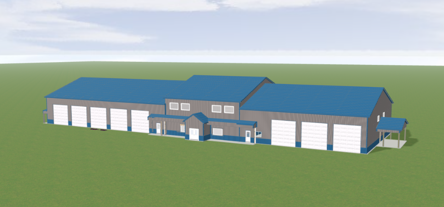 can you make this look more realistic as if taken from a camera add a parking lot in front and to the right of the building add some trees and a set of railroad tracks in the background also add one row of windows to the overhead doors