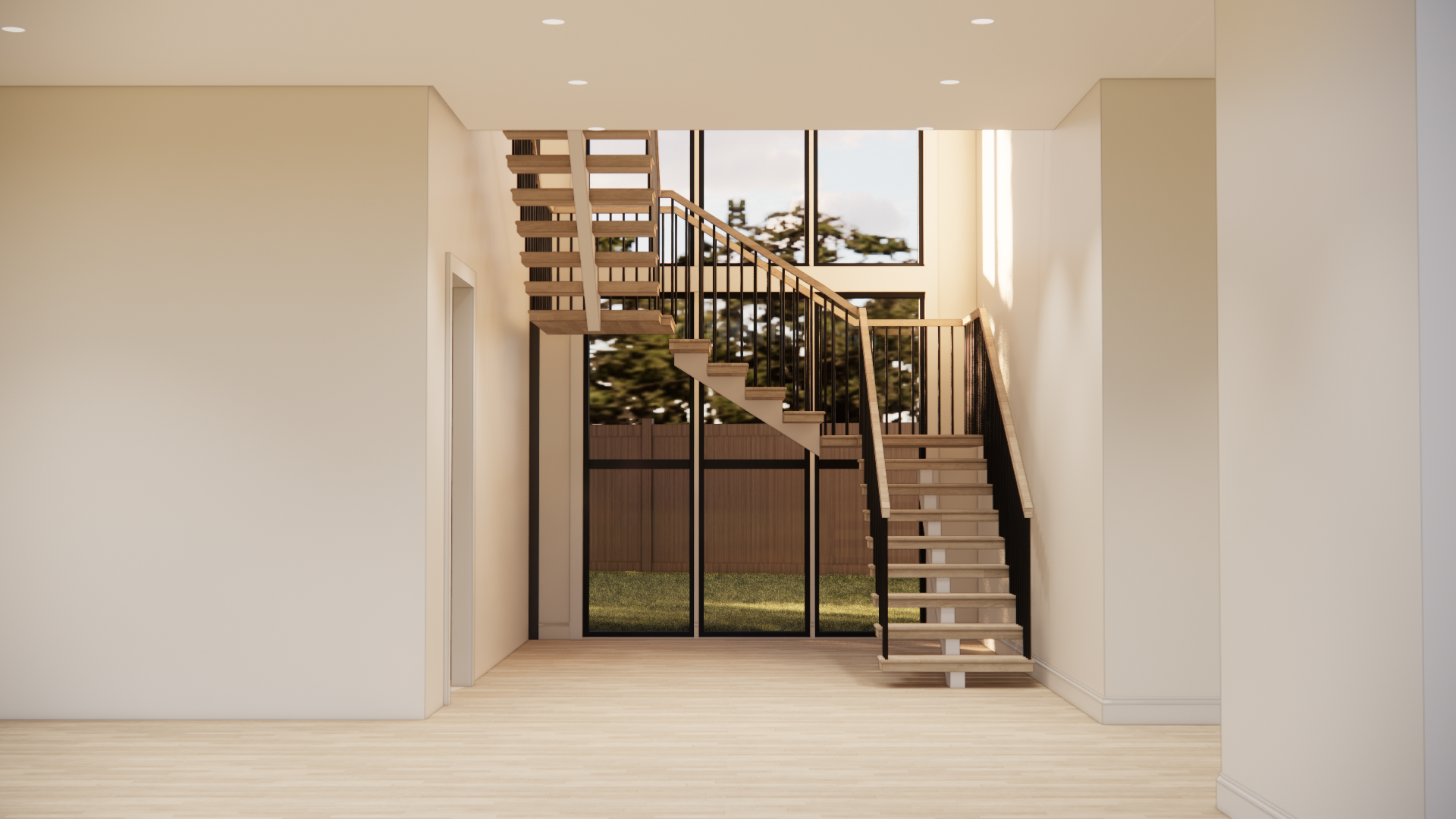 convert this interior architectural rendering into a highly realistic editorial style architectural photograph while maintaining the exact architecture layout materials and proportions shown in the rendering do not redesign restyle or modify anything no creative interpretation only enhance realism do not add any prompts text labels graphics or overlays to the image a reference image of the staircase will be attached the staircase in the rendering must match the reference image exactly use the reference to replicate the stair construction proportions and detailing the staircase should include floating wood treads a white zig zag stair stringer supporting the treads black vertical metal balusters a wood handrail that matches the tone of the treads maintain the same tread thickness spacing between treads railing layout and structural appearance as shown in the reference image do not change the staircase architecture angle layout or proportions from the rendering the reference image is strictly to ensure the stair design and detailing match exactly the flooring is builddirect seashore wide plank wood flooring maintain the exact tone and plank layout from the rendering while enhancing realism through natural wood grain detail subtle tonal variation and a soft matte finish lighting should resemble luxury editorial interior architectural photography natural daylight entering through the large windows sunlight casting soft shadows across the flooring and stairs realistic shadow depth beneath the floating treads balanced interior exposure with natural highlights camera style should resemble professional architectural photography full frame camera perspective approximately 35mm lens straight vertical lines crisp material clarity natural depth of field do not add or remove furniture decor fixtures lighting or architectural elements maintain the exact composition and materials from the rendering the goal is strictly to enhance realism lighting and material texture so the image appears like a high end luxury real estate photograph while preserving the original design exactly