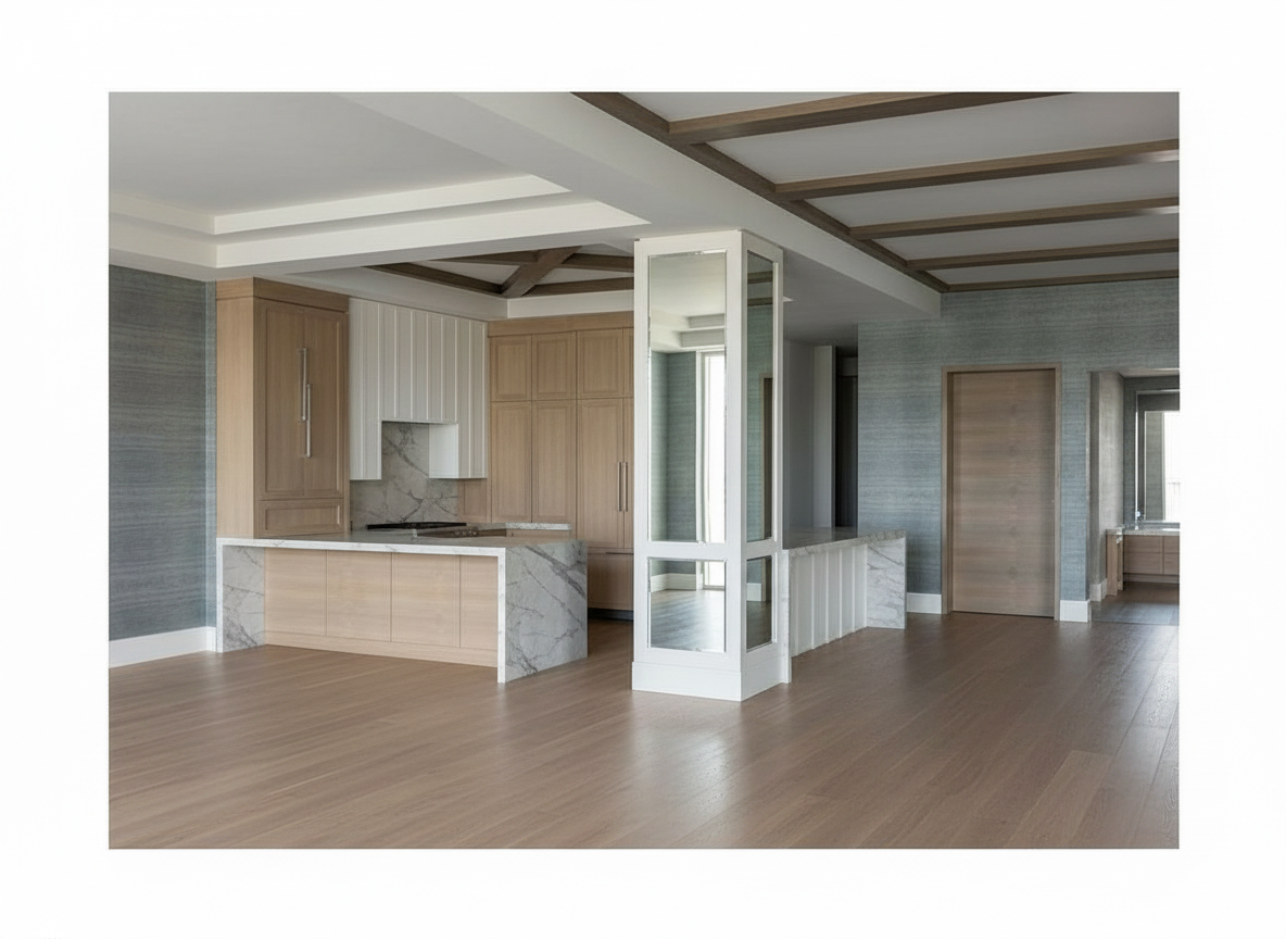 transform the provided elevation into a hyper realistic interior photograph that is indistinguishable from a real professionally shot interior design photograph this must read as a real space captured by a camera not a rendering not a visualization not architectural cg not concept art and not an illustration geometry lock non negotiable preserve the exact original geometry layout proportions ceiling details wall depths panel divisions openings doors cabinetry locations millwork dimensions built ins and circulation paths with zero architectural changes nothing may move scale simplify or be reinterpreted geometry must remain absolutely unchanged camera derivation critical derive the camera position height angle and framing strictly from the uploaded elevation eye level interior photography centered or naturally balanced composition 24 35mm interior lens feel no dramatic angles no stylized framing do not reuse or approximate camera framing from any previous image remove all drawing artifacts completely remove all linework cad edges drafting outlines diagrammatic shapes sketch artifacts nothing may appear outlined flat schematic or illustrative the elevation must be visually reinterpreted as a finished real interior photograph material realism rules wood if present smooth solid plank material extremely subtle restrained grain matte or soft satin finish only no graphic patterns no decorative striping no visual noise wood must absorb light gently never glossy or sharp fabric upholstery if present soft compression subtle seams gentle shadowing natural fabric texture no flat color blocks stone slabs if present light natural veining soft organic variation low contrast no symmetry no bold or busy patterns stone must feel heavy and grounded walls fine surface texture slight tonal variation never flat paint edge construction realism all edges corners joints and transitions must be softly broken and physically realistic no razor sharp corners no cgi perfect edges slight construction tolerances only everything must read as fabricated installed and dimensional lighting photographic behavior lighting must behave like real high end interior photography natural daylight only unless otherwise specified realistic light bounce gentle shadow falloff uneven exposure distribution subtle brightness variation across surfaces avoid studio lighting uniform illumination over clean exposure global illumination look slight softness is preferred over sharpness camera image imperfections very important introduce subtle photographic characteristics gentle lens softness micro exposure variation natural contrast roll off mild atmospheric depth primary plane sharp background slightly softer the image must feel captured not generated absolute constraints no creative interpretation no stylization no exaggeration no added or removed elements any deviation from the original elevation geometry or intent is unacceptable negative prompt always include architectural rendering 3d visualization cgi unreal engine octane vray sketchup look flat textures graphic lines outlined edges over sharpened studio lighting concept art illustration ai look plastic materials glossy wood high contrast grain perfect symmetry keep design as shown in the picture keep the design as it is in image light cabinets are white and brown cabinets are white oak keep design in the image as it is
