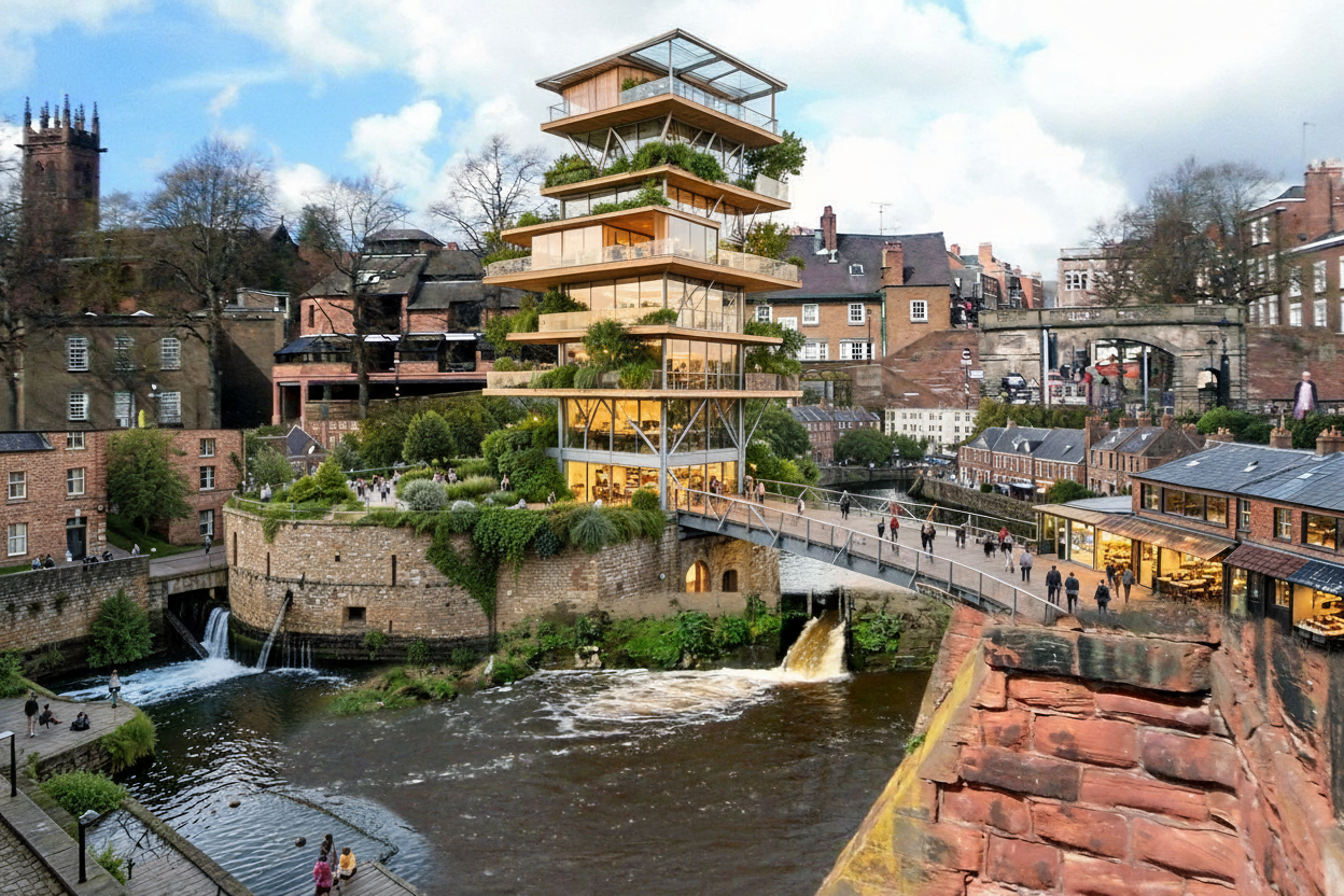 replace the stone base for the tower with chester hydro building made in the pink sandstone shown on the reference image