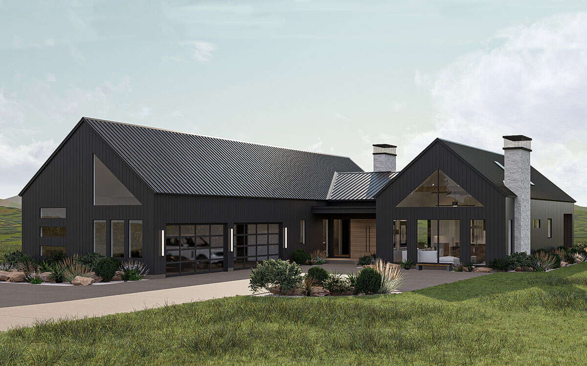 a modern farmhouse with a sleek black metal roof and dark charcoal siding accented with large windows reflecting natural light the chimneys are crafted from light gray stone adding a rustic touch the surrounding landscape features lush green grass and strategically placed bushes with a mix of deep green and earthy tones the sky is a soft pastel blue with wispy white clouds creating a serene and peaceful atmosphere emphasize a bright and airy ambiance highlighting the clean lines and contemporary design of the structure