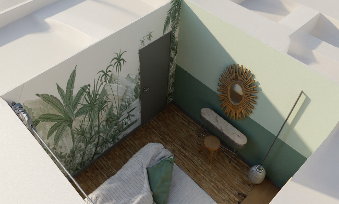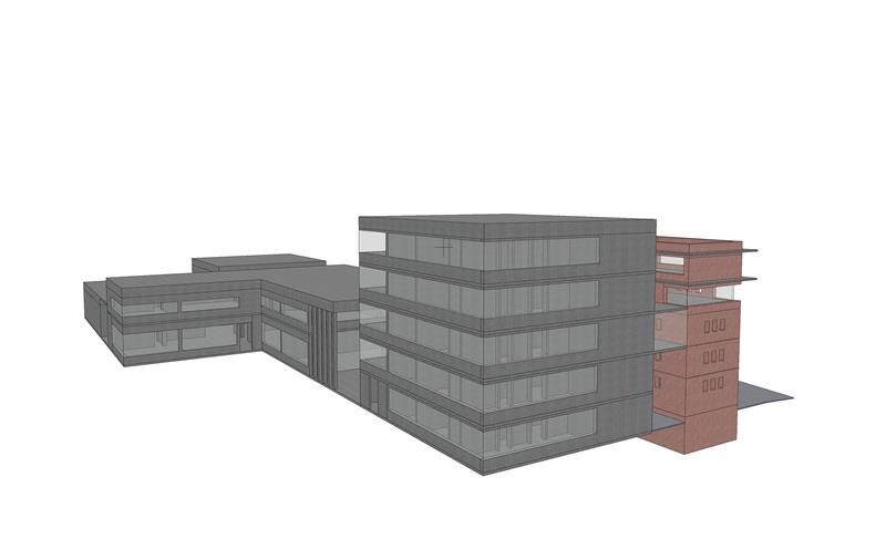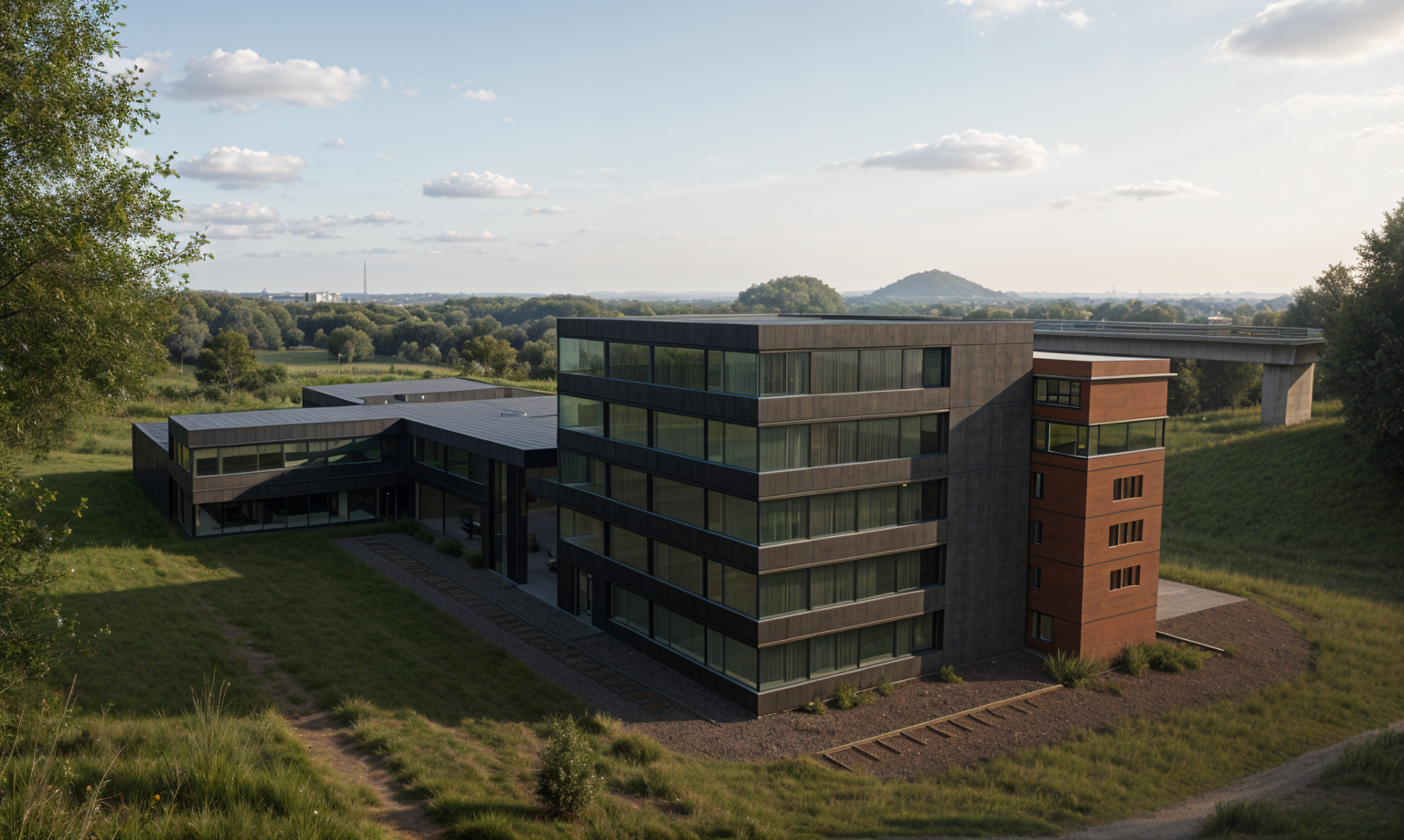 a realistic setting around the inserted buildings showing an open railway landscape with overgrown vegetation tall grasses small shrubs and scattered young trees the scene includes lightly industrial surroundings with a few low industrial buildings in the distance a raised road bridge on the right side and a bright clear sky with soft clouds the atmosphere feels open green and slightly rough shaped by railway terrain and natural vegetation blending into the industrial edges of berlin