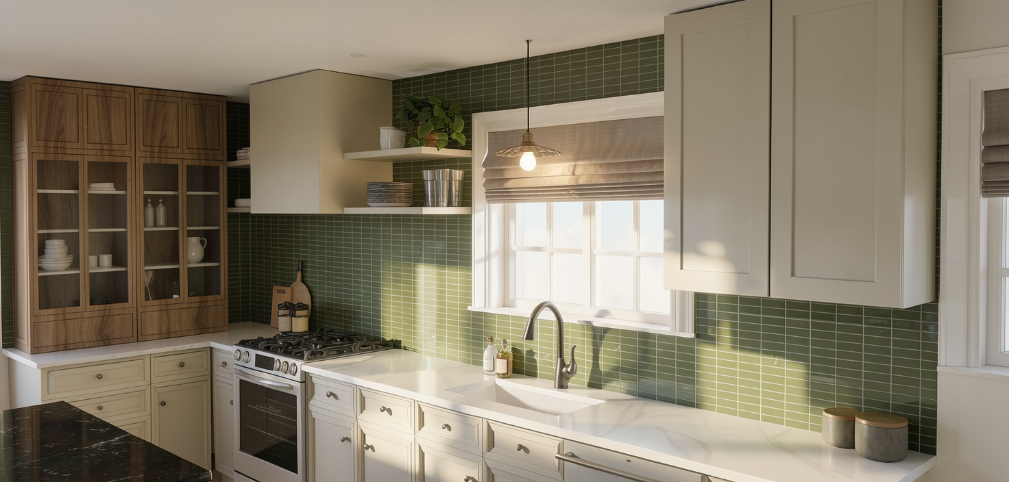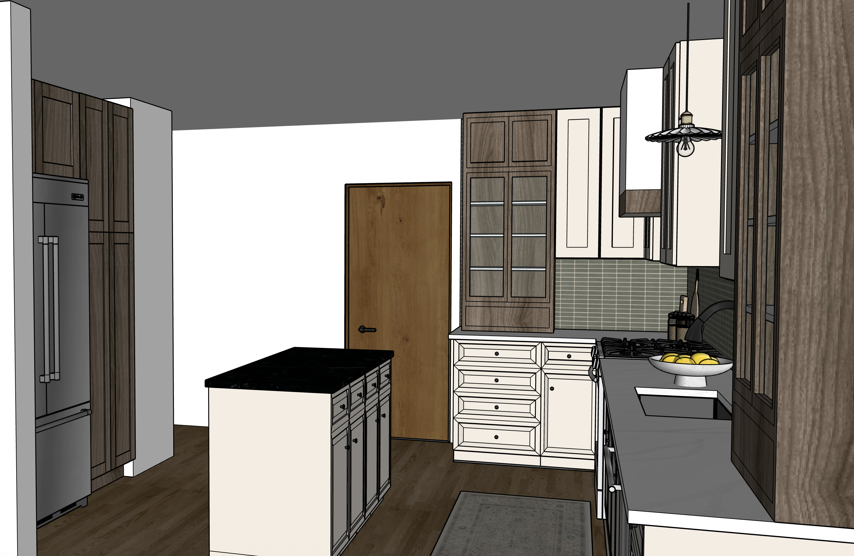 lighten up the wood tone of the wood upper cabinets to a lighter walnut turn off the lights and make it a more daylight photo keep all of the upper photos around the range painted a warm white and keep the counters on the main part of the kitchen a white quartz with a subtle grey veining the island should be a black stone as is lighten the floors to look like aged white oak
