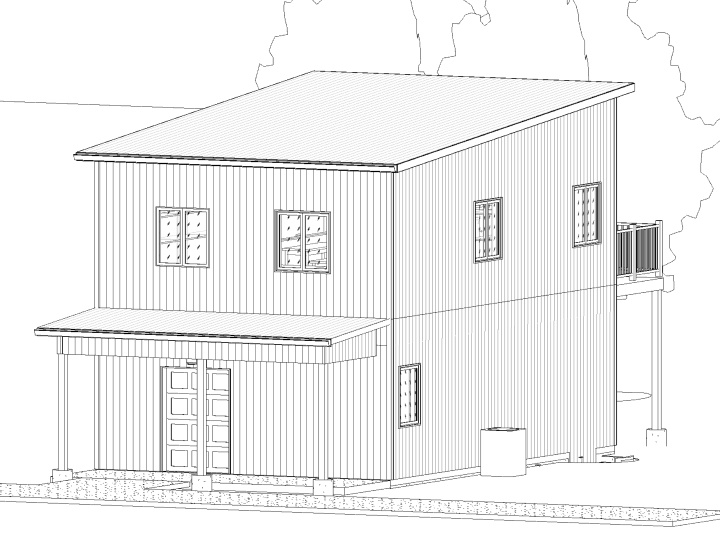 all vertical steel siding to be black with black trim black steel roof black windows doors wood columns beams add landscape at foundation but not in front of door this in a rural area surrounded by trees and fields