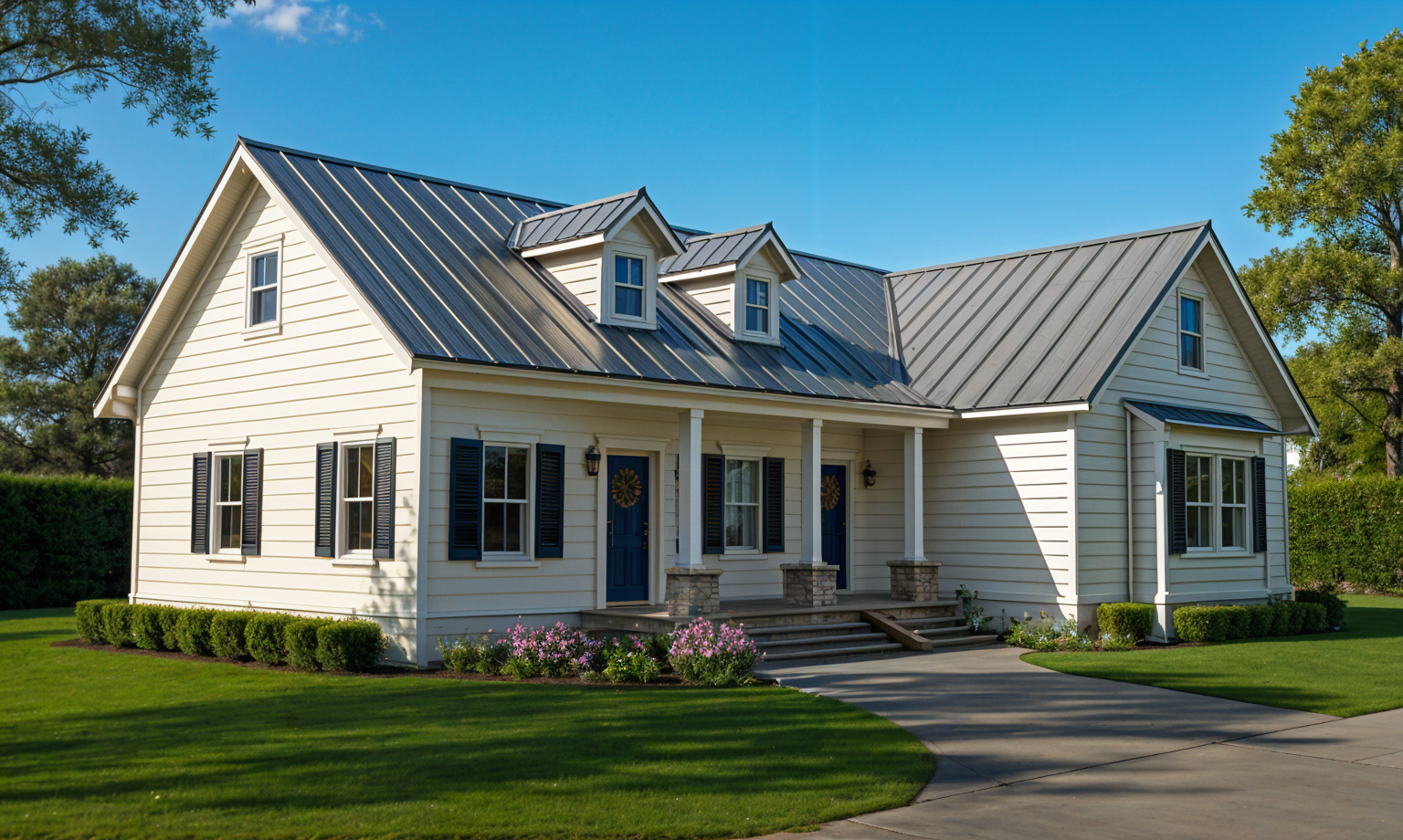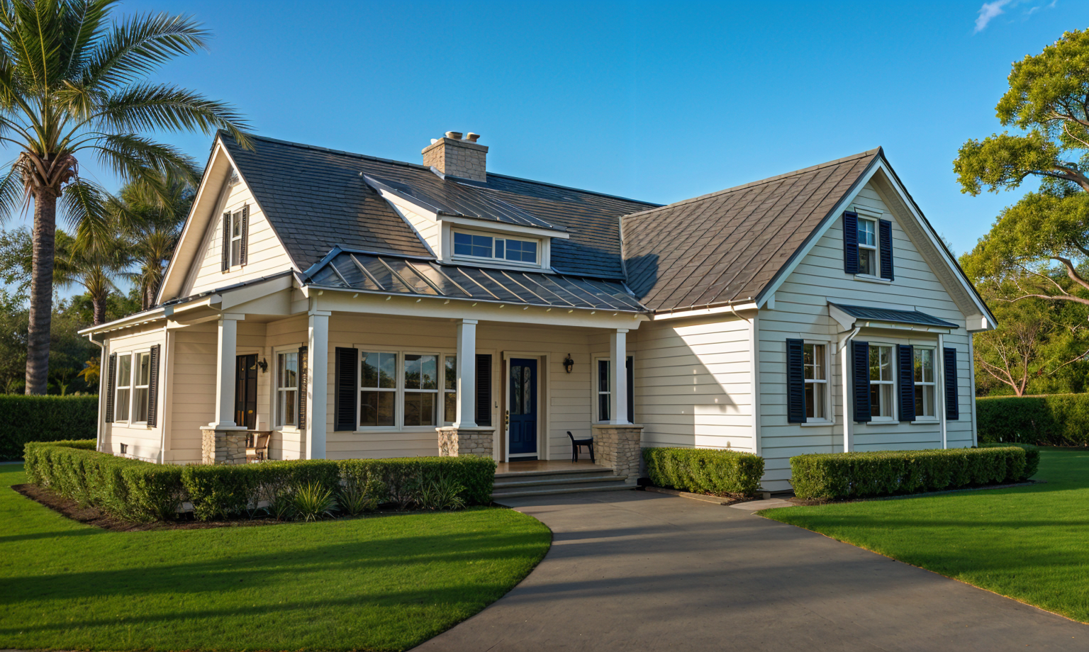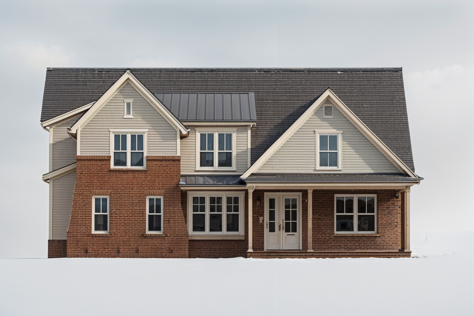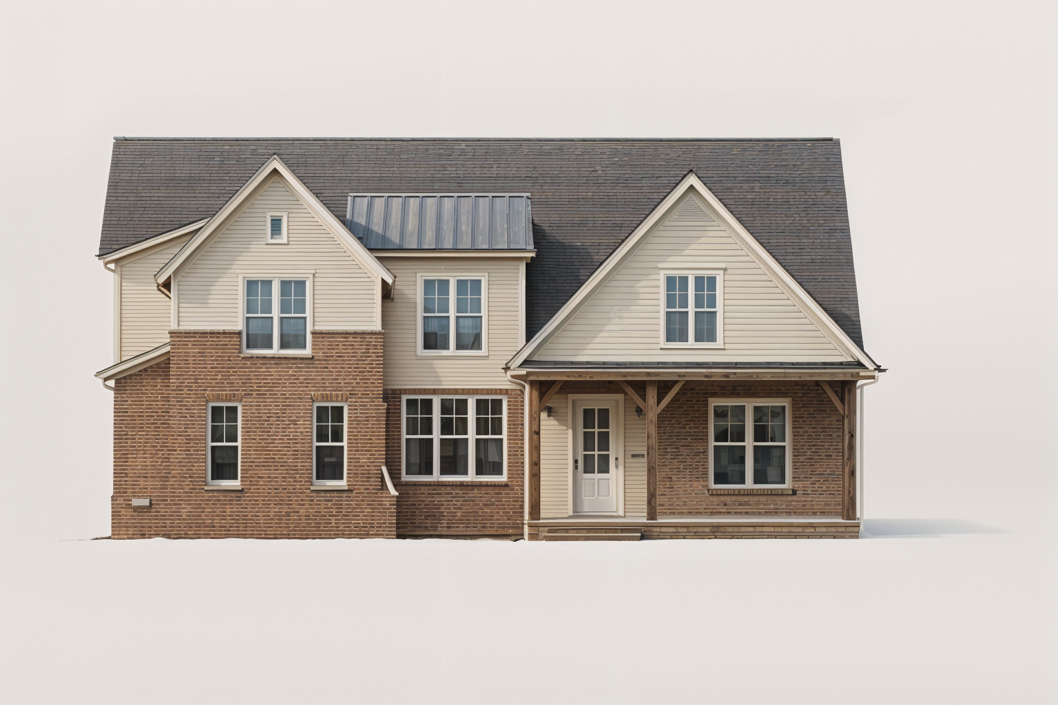 render in a craftsman style with light earthtone cultured stone stone sill black window frames dark bronze color vertical shiplap gap siding dark gray tone asphalt roofing and cultured stone chimneys show grass and bushes in front