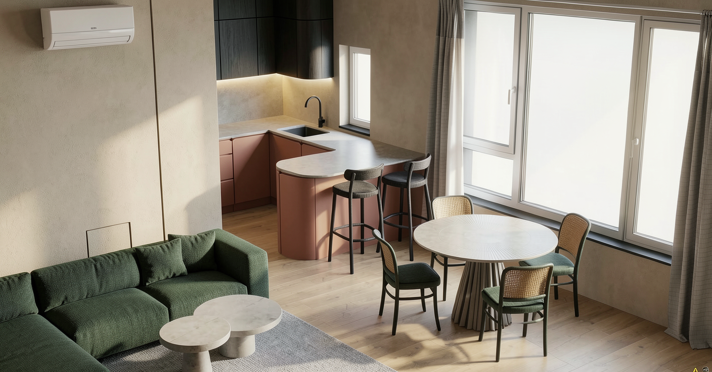 finish this office in the back there should be a big black cupboard hiding the complete back wall in the lower ceiling part also hiding the black truss construction in front of that under the separation of the high en lower ceiling part a black wooden desk with office chair and 2 client chairs dark brown carpet on the floor and black storage cupboards on the left side