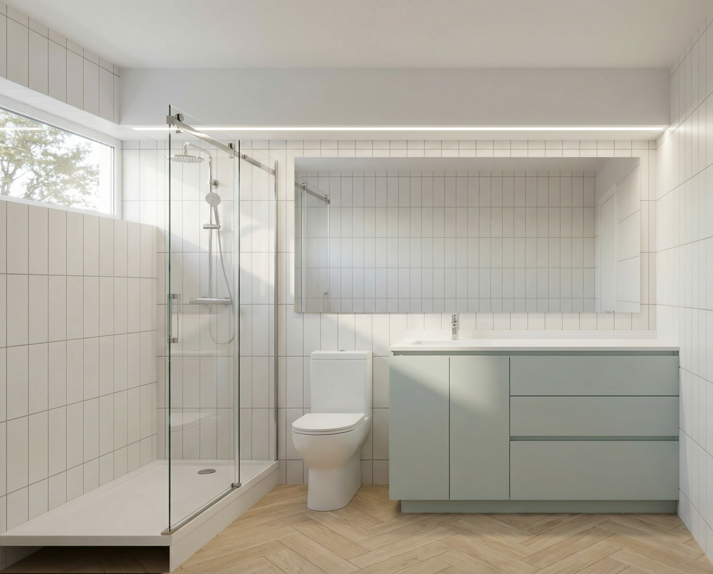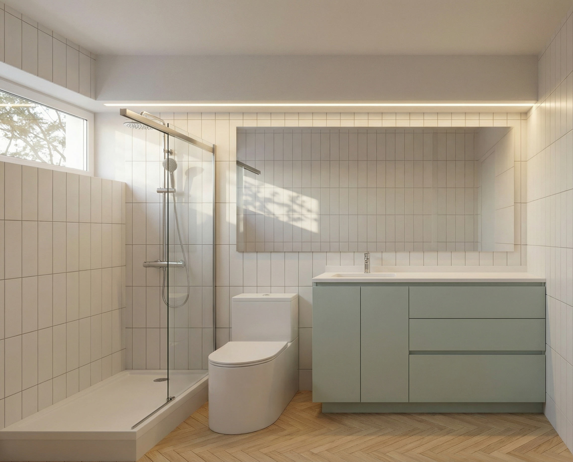 interior rendering instructions bathroom light colored wooden parquet flooring laid in a 45 degree herringbone pattern matte white ceramic wall tiles 30 10 cm installed vertically white countertop black wood cabinet with visible natural wood grain place a wall mounted vanity basin on the left side of the cabinet with a chrome plated steel faucet place a standard wc between the vanity cabinet and the shower area modify the existing shower tray geometry bottom left and replace it with a white shower tray install a sliding glass shower door over the shower tray enclosing the shower area within the bathroom on the back wall above the shower tray install a chrome plated steel shower set including shower bar and shower head place a mirror above the vanity and the wc install a continuous led strip light integrated into the beam above the vanity running along the entire length of the bathroom the beam is white with no tiles applied the window glass should be clearly visible with subtle reflections exterior lighting should be soft morning light with gentle daylight and partially visible tree branches outside creating a calm and natural atmosphere in the mirror reflection very soft reflection the vertically installed 30 10 cm ceramic tiles must be visible along with a black door on the right side of the image