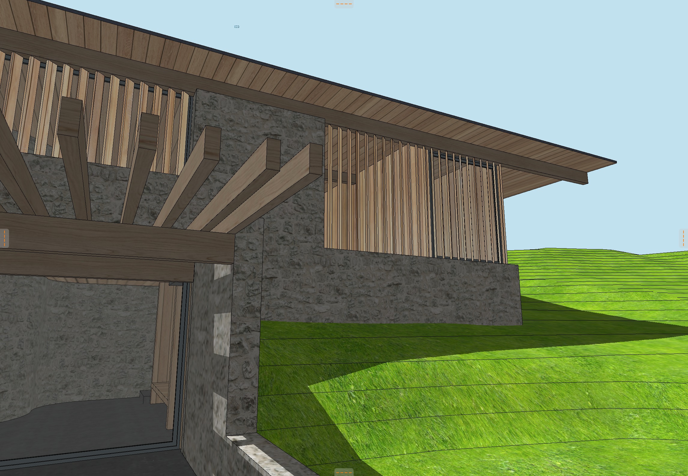 landscape hillside with sagebrush and tall wild grasses brown drystack stone walls light coming through the vertical wood louvers add a person walking under the pergola on the lower level